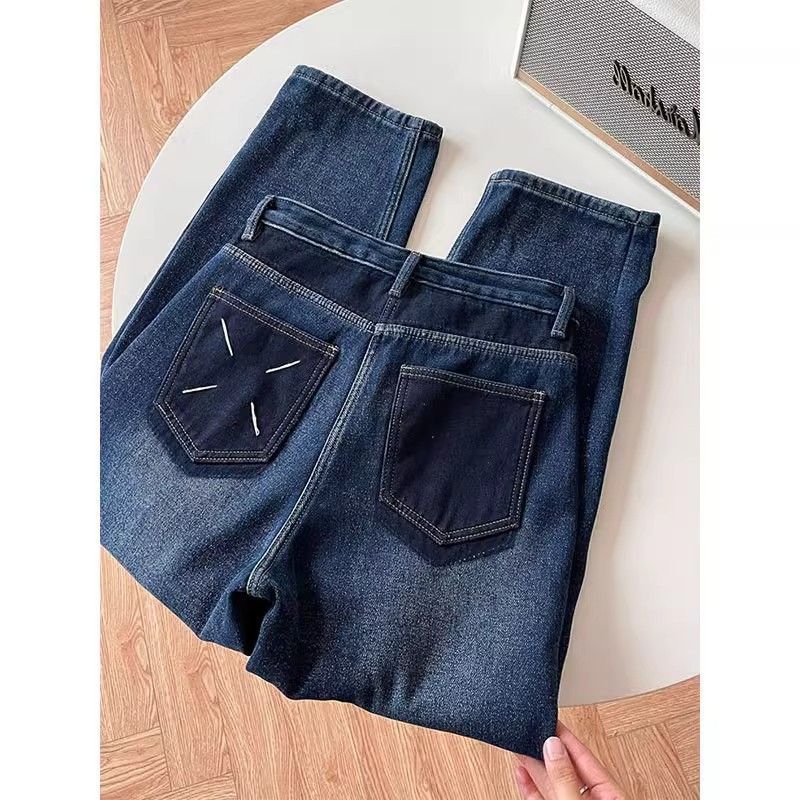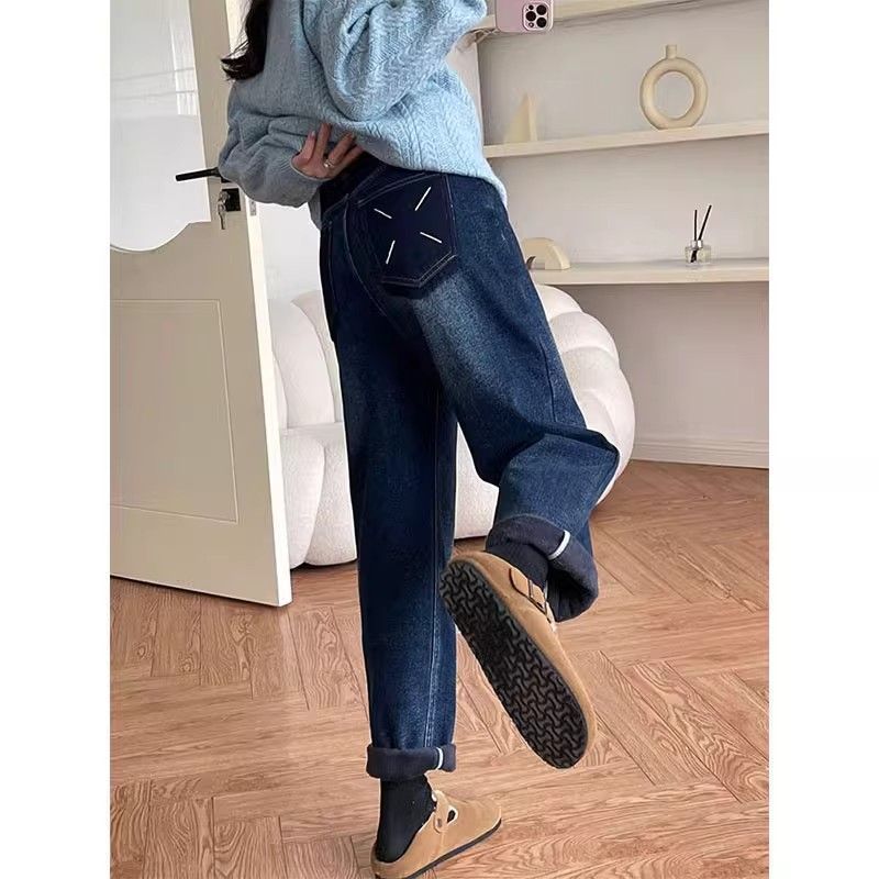 加绒加厚牛仔裤女秋冬季新款梨形身材大码高腰显瘦宽松复古哈伦裤
