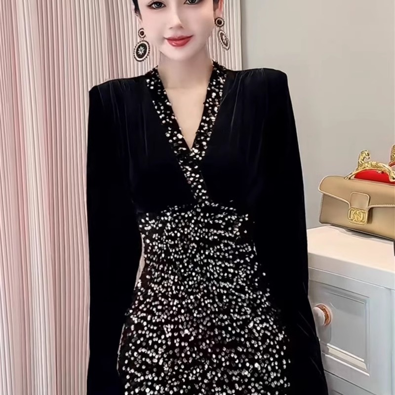 赫本风高级冬季新款名媛气质时尚纯欲长款亮片拼接V领包臀连衣裙