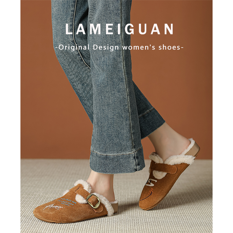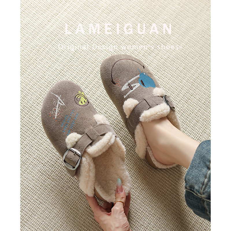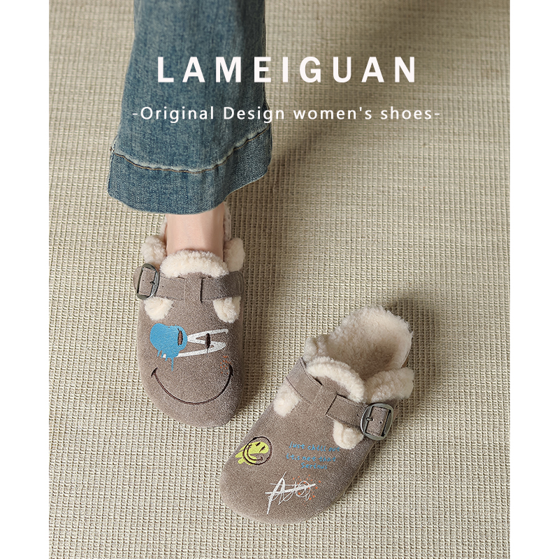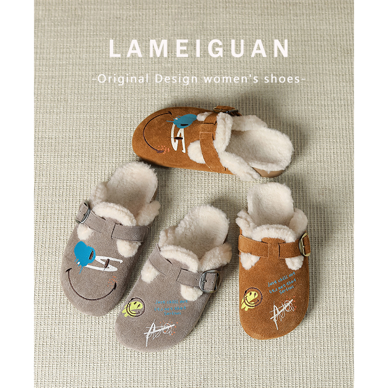牛皮版!涂鸦加绒厚底包头毛毛鞋女外穿2025秋冬新款真皮勃肯拖鞋