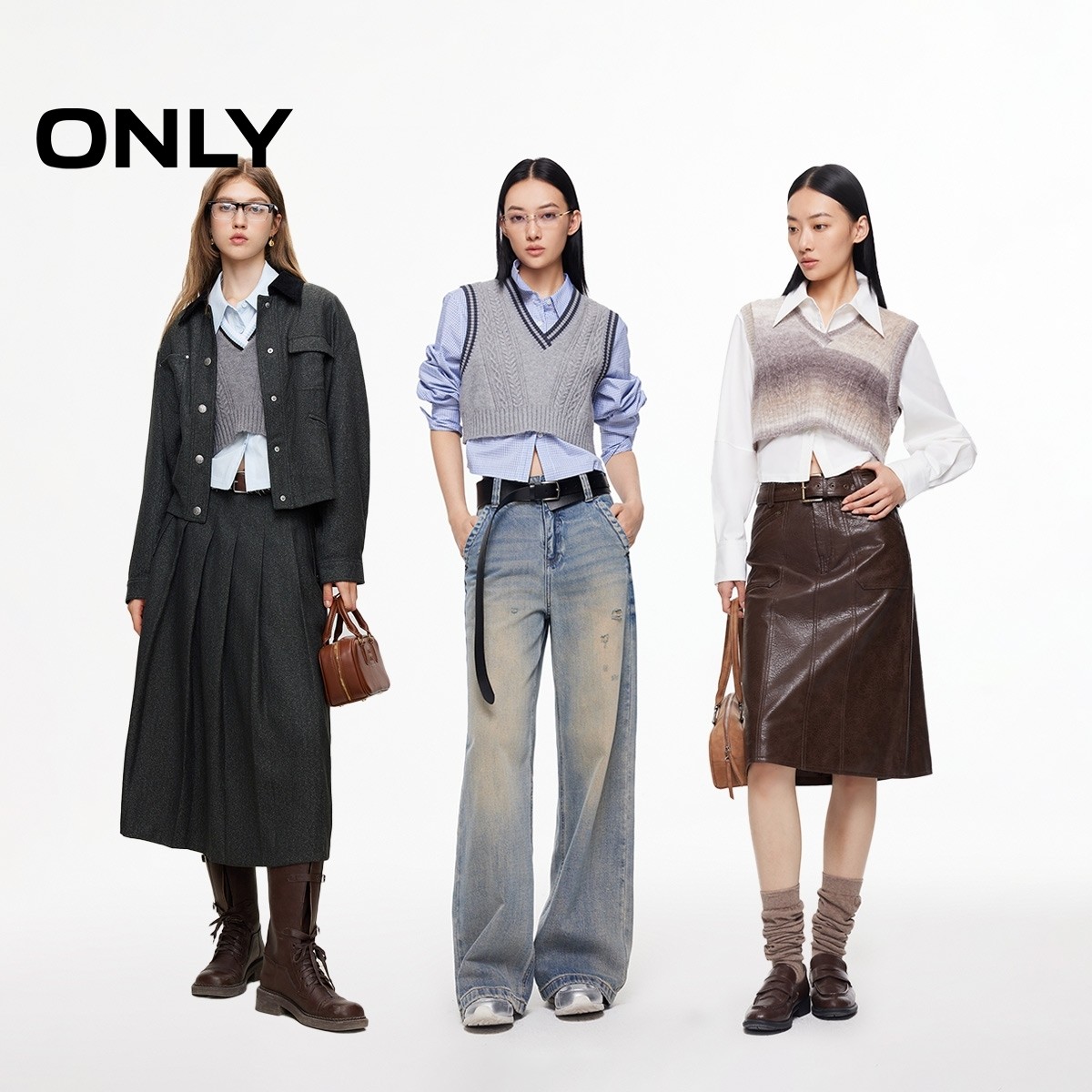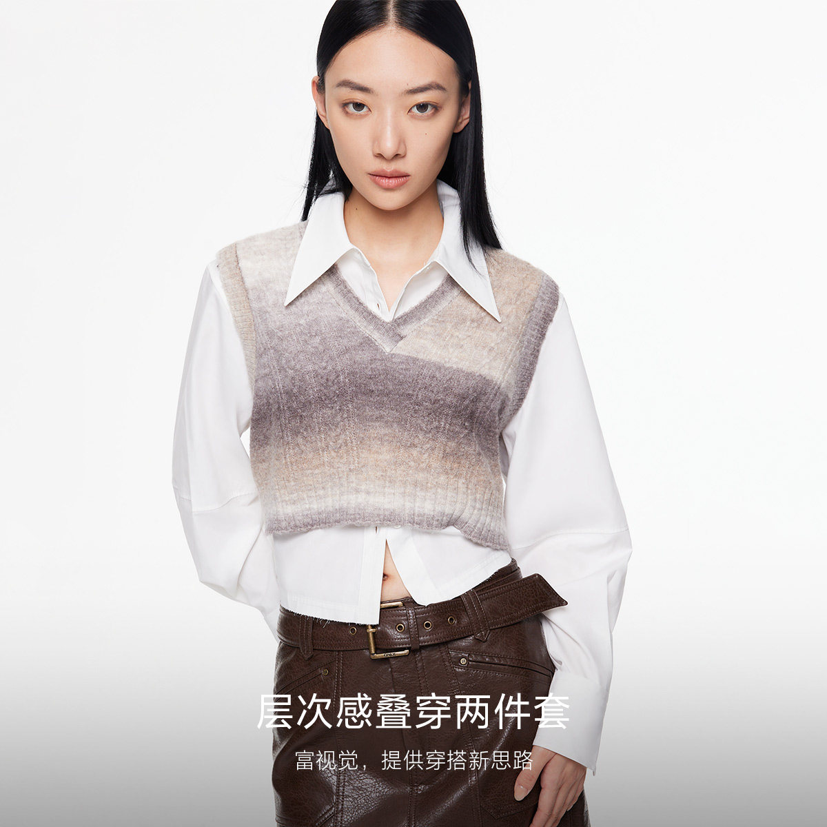 ONLY秋季学院风洋气拼色拼色拼色针织马甲套装短款衬衫女
