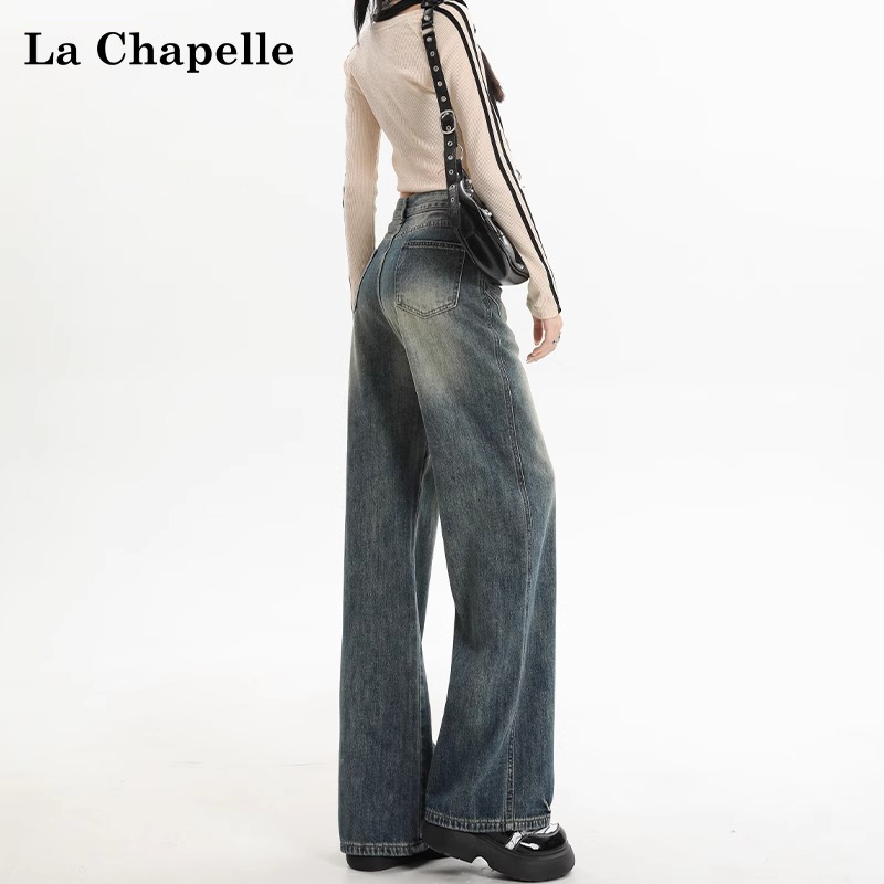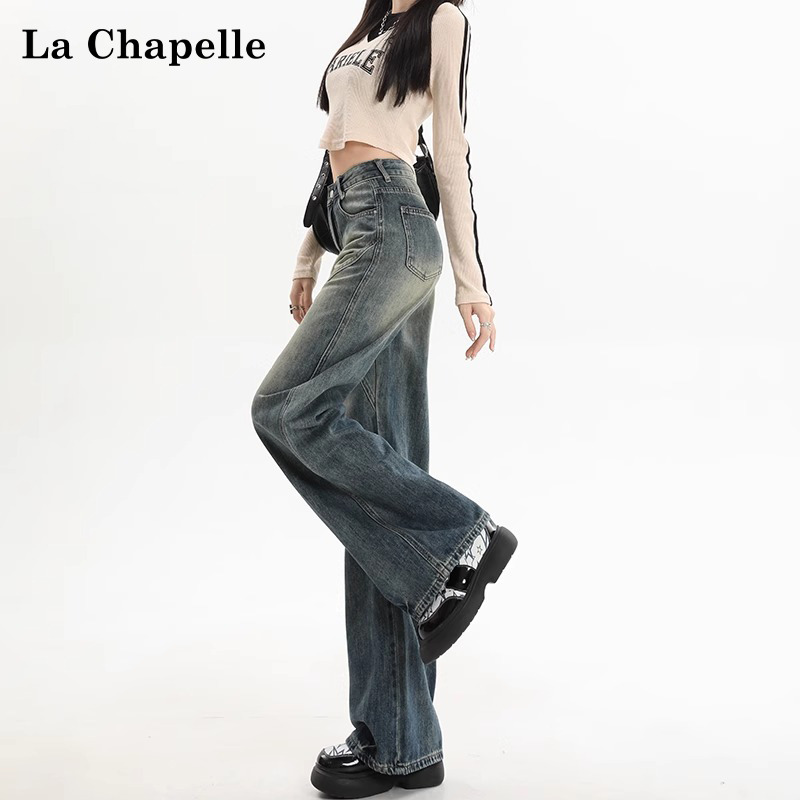 拉夏贝尔美式阔腿牛仔裤女2025春季复古高腰宽松垂感窄版直筒长裤
