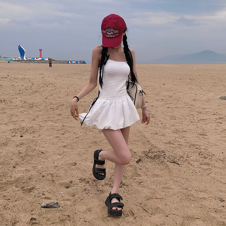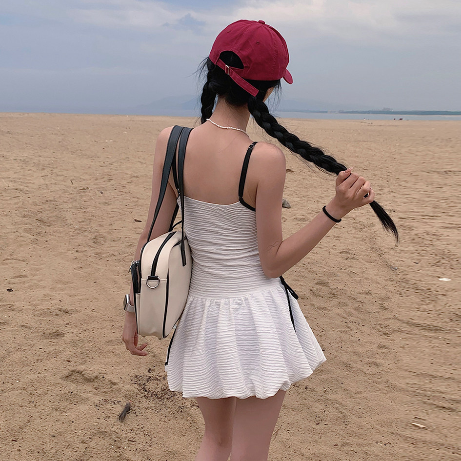 大渔 2025新款清新甜美少女裙式保守遮肉显瘦白色系带连体泳衣女