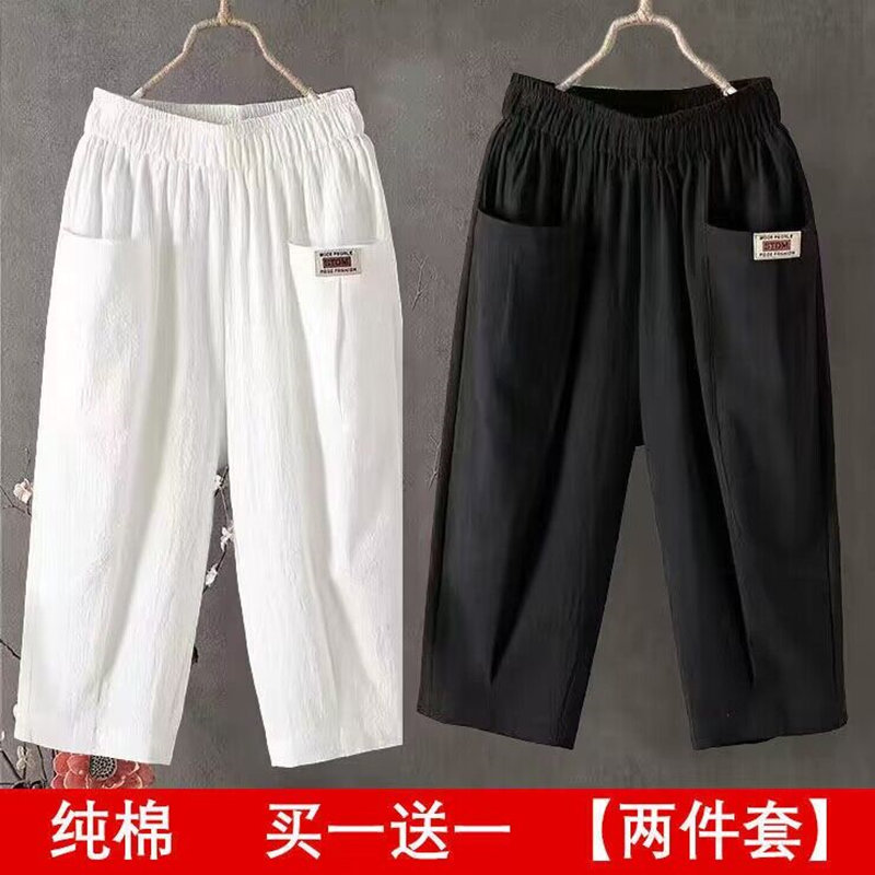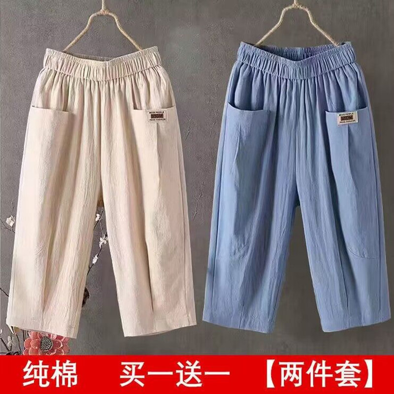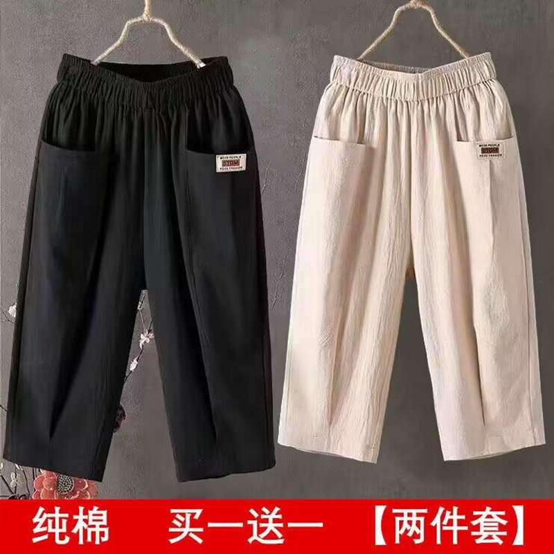 中年妈妈纯棉七分裤女夏季薄款棉麻休闲裤宽松大码松紧腰哈伦裤子