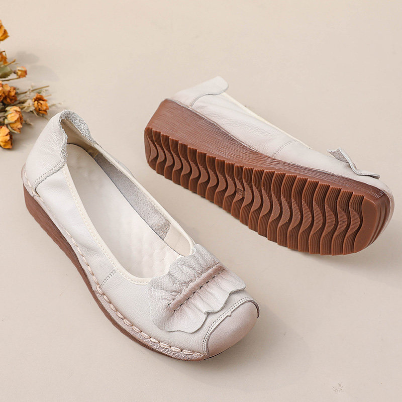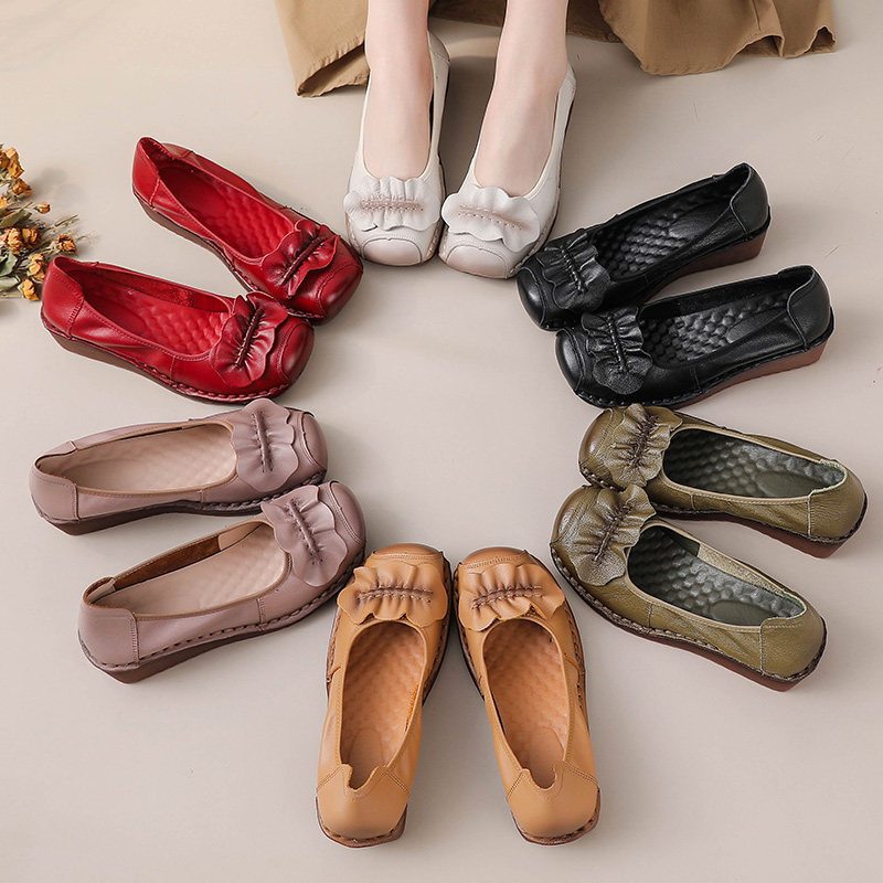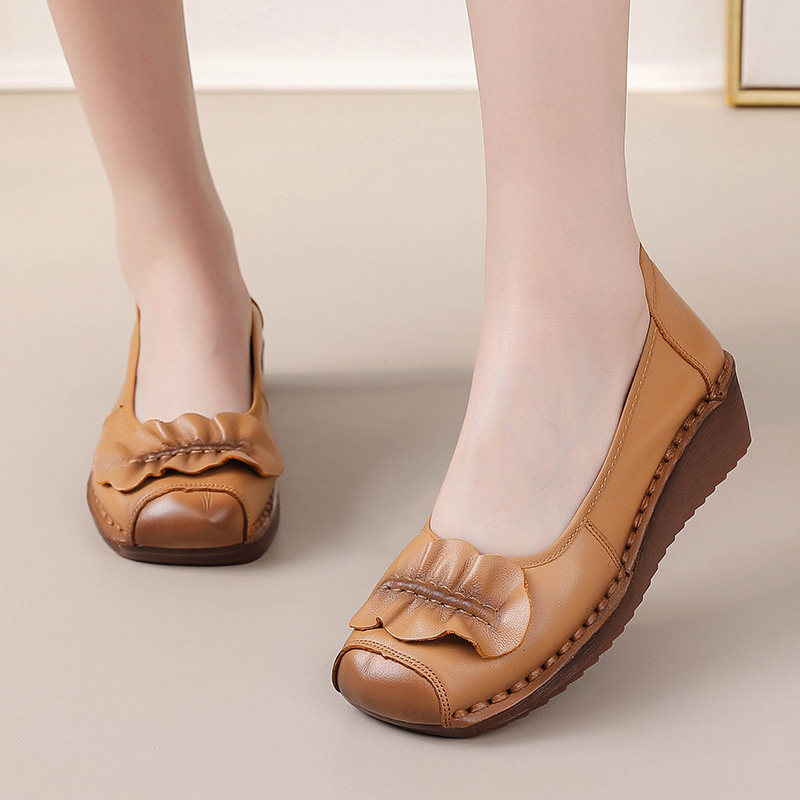 复古民族风妈妈鞋真皮浅口女鞋软底中年舒适中老年坡跟牛筋底单鞋