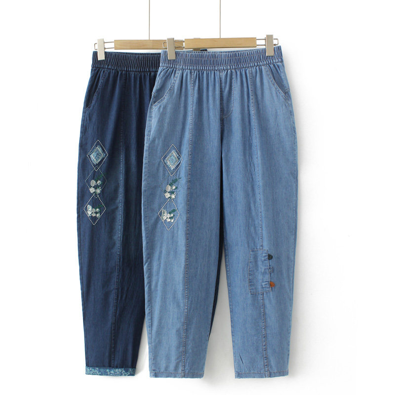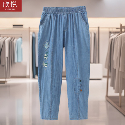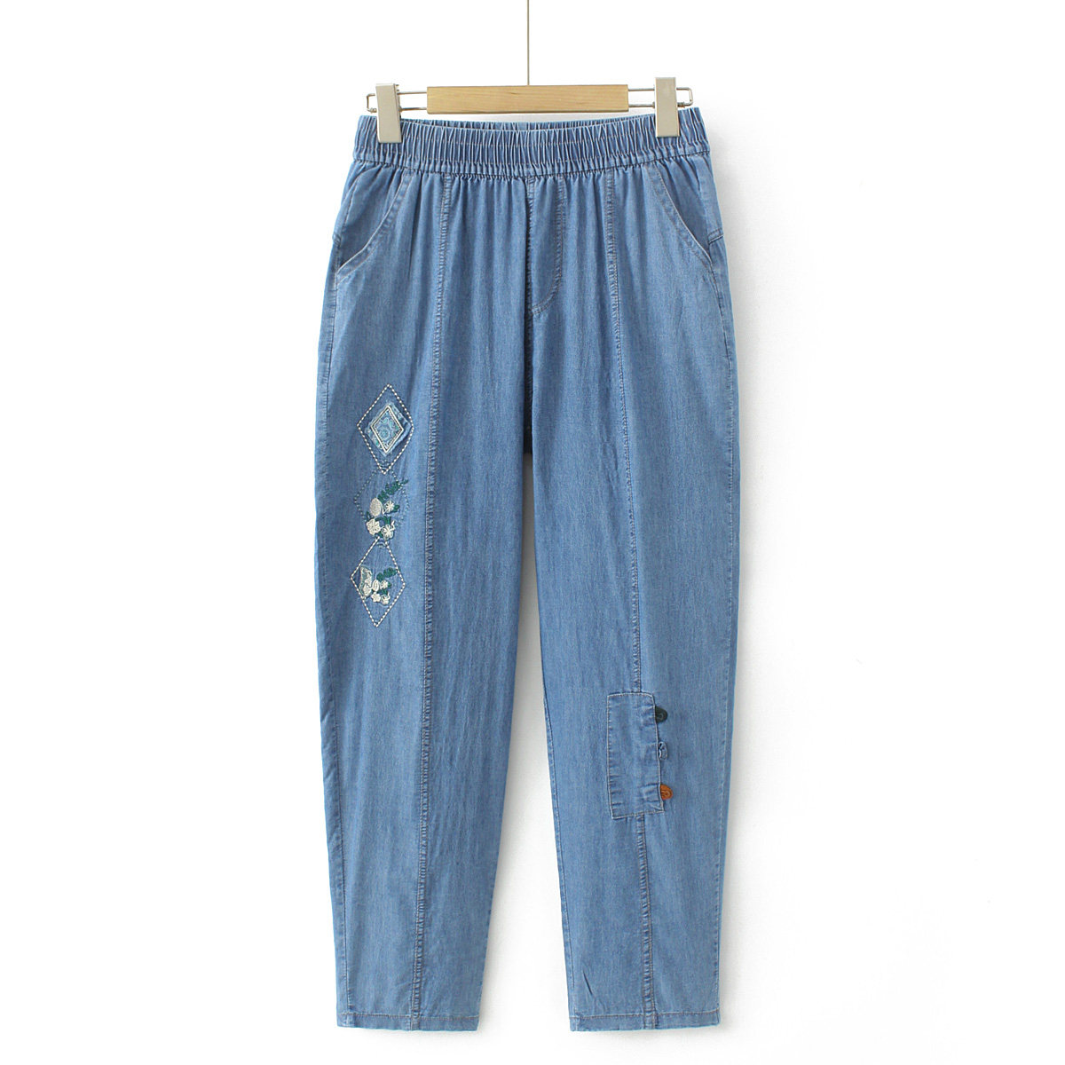 夏季新款宽松牛仔裤女中年妈妈松紧腰薄款绣花女裤大码弹力九分裤