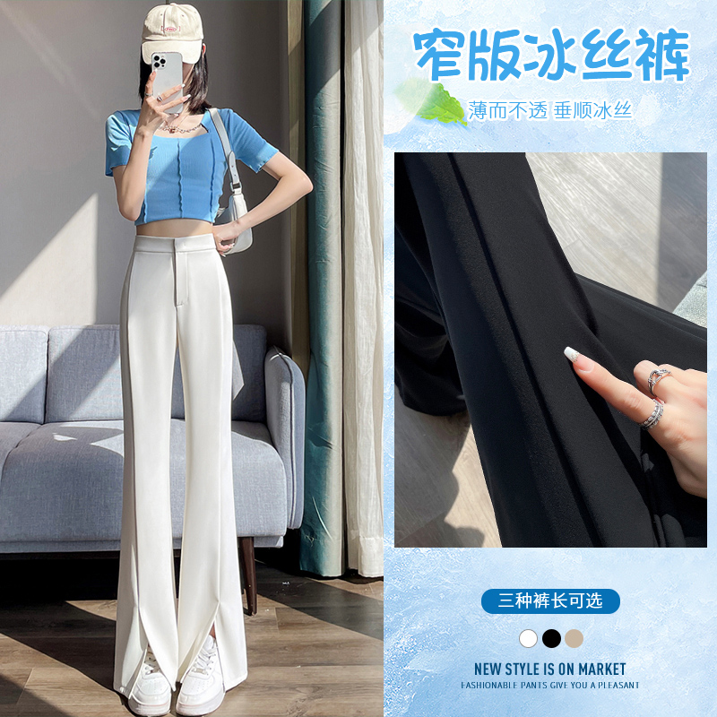 实拍2023夏季开叉冰丝西装裤高腰窄版阔腿裤薄款直筒拖地裤女