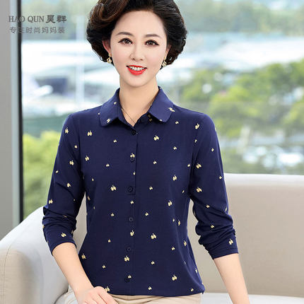 昊群2024新款妈妈款纯棉春秋装翻领t恤女中老年长袖印花翻领上衣