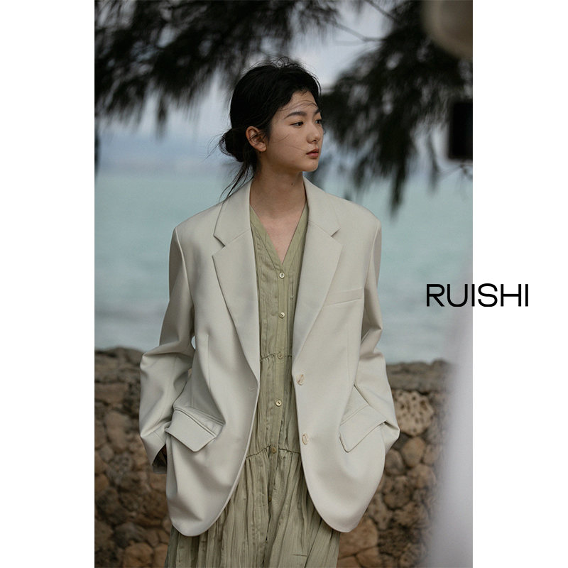 芮时 半精纺羊毛 气质盐系色率性时髦落肩休闲西装外套上衣女春秋