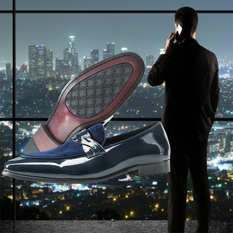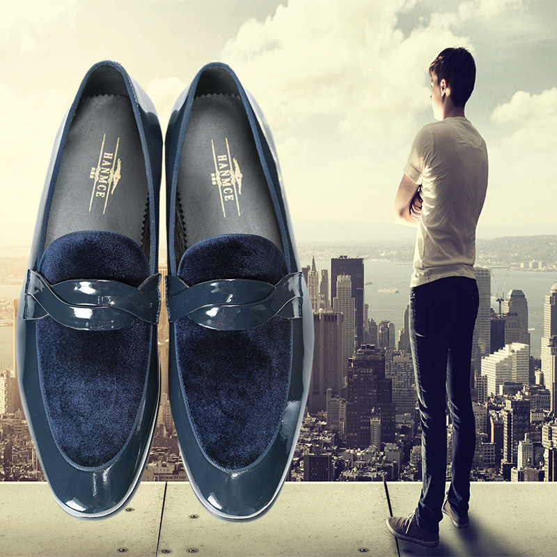 广州汉慕思漆牛皮拼接天鹅绒休闲乐福皮鞋蓝色一脚蹬拼色透气大码