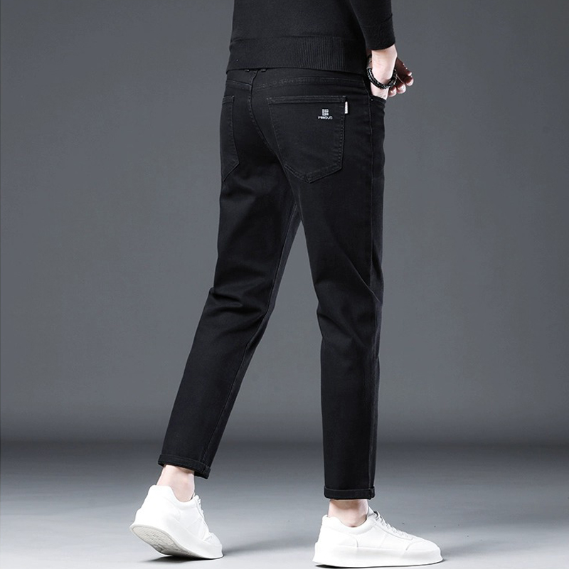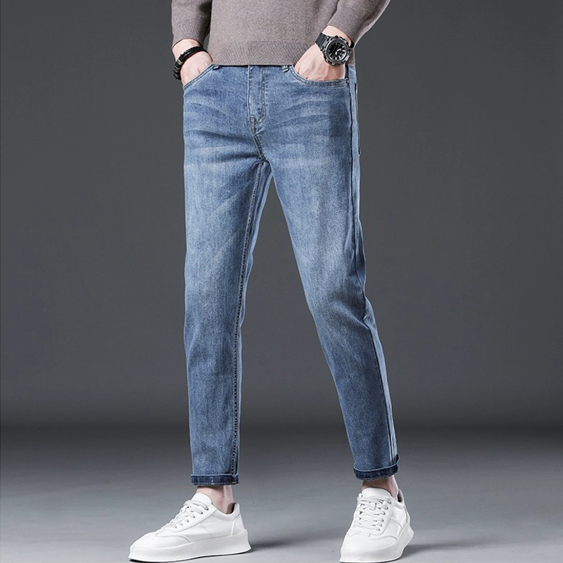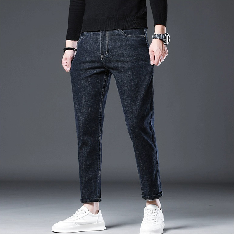 法国水洗牛仔裤男士修身直筒复古九分裤子秋冬款加绒加厚休闲裤