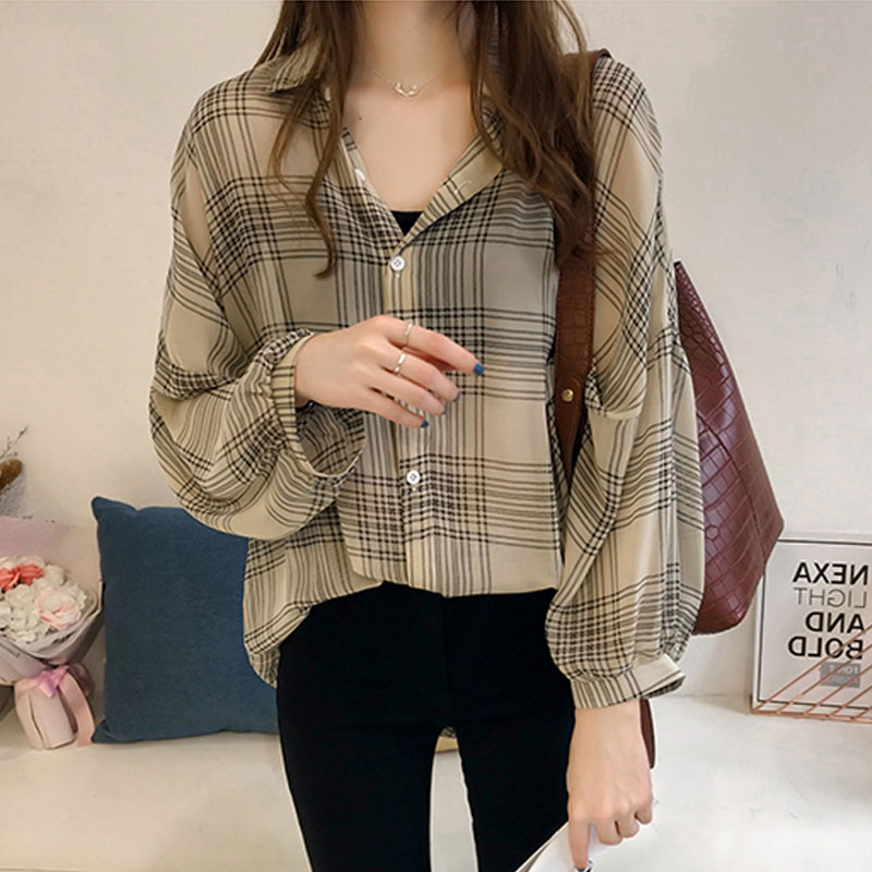 格子长袖防晒衬衫女夏季薄款雪纺设计感小众复古港风别致上衣外套