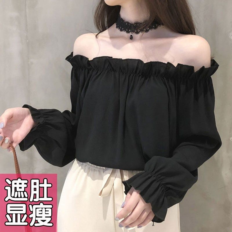 加肥加大码一字肩上衣女夏季锁骨雪纺衫长袖露肩荷叶边胖mm200斤