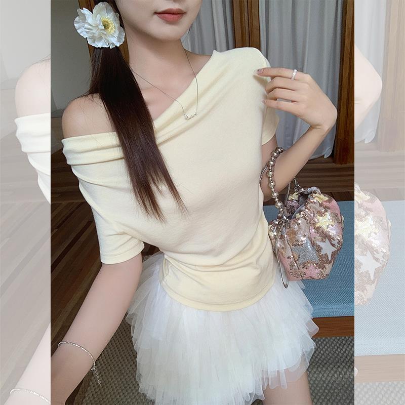 法式荡领短袖T恤女夏季纯欲风性感辣妹修身褶皱收腰小衫体恤上衣
