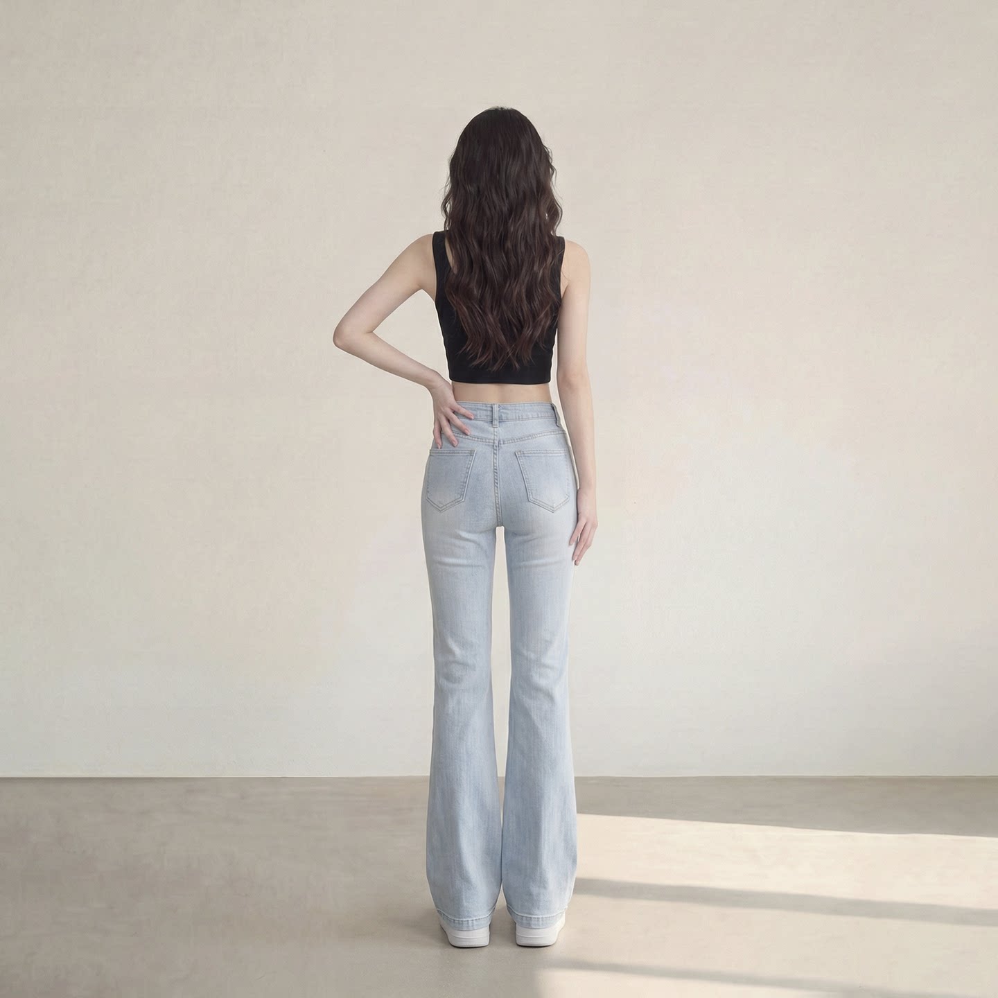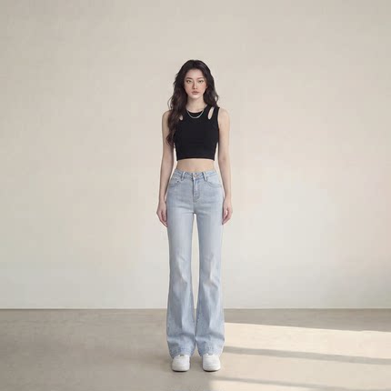 艾格复古高腰喇叭牛仔裤女水洗浅蓝色显瘦拖地裤百搭微喇长裤