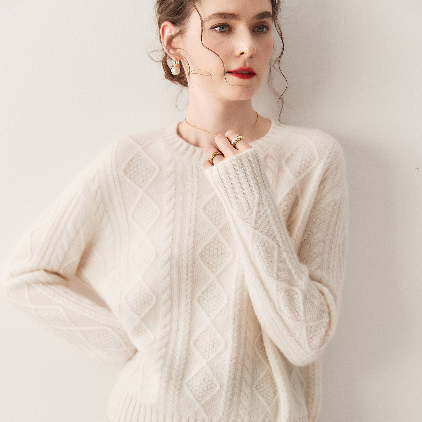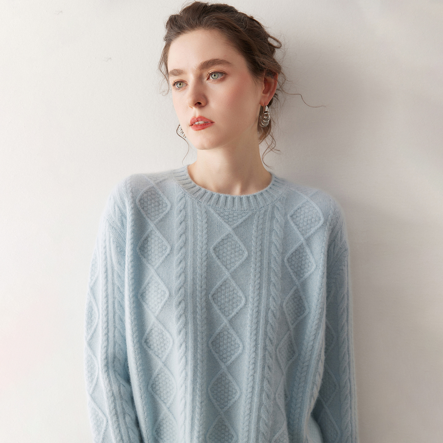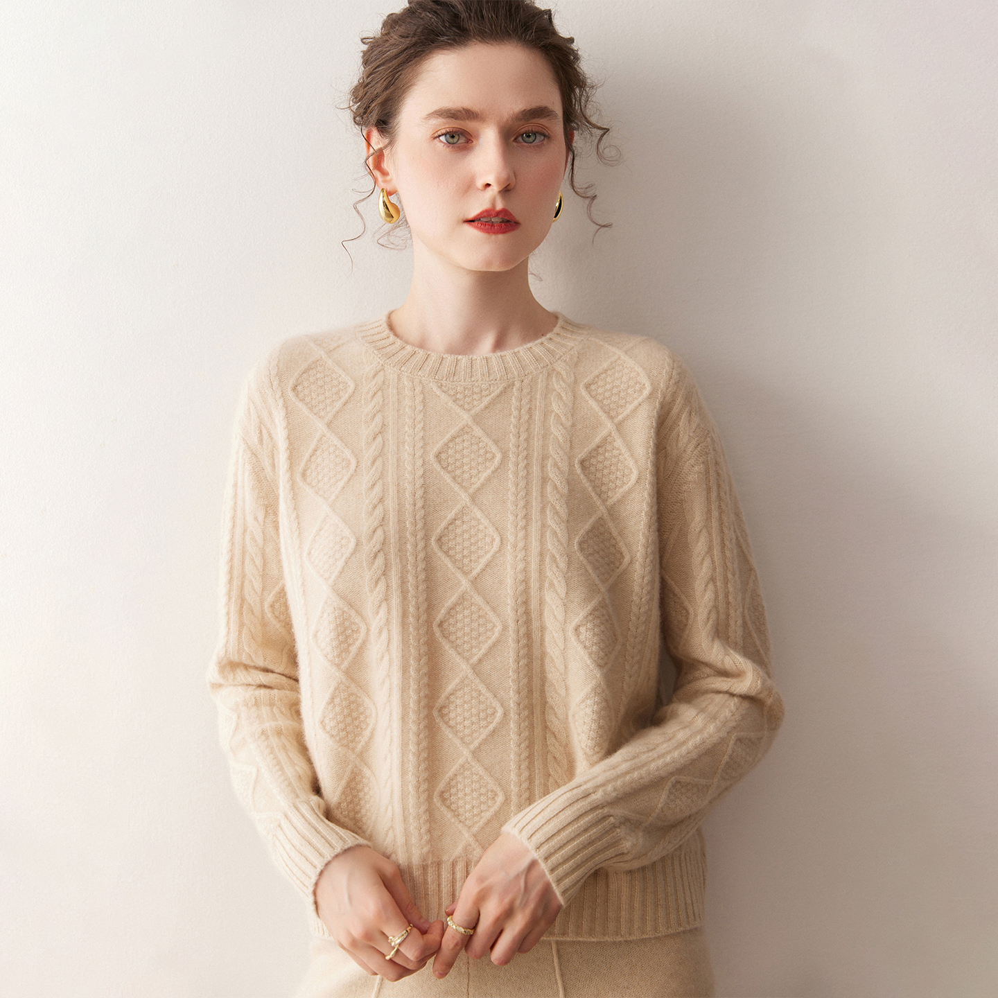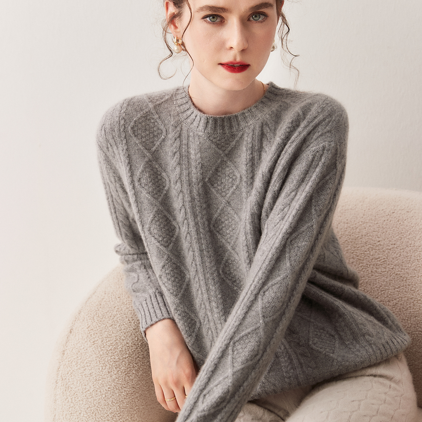 重磅新款100%纯山羊绒衫女圆领绞花宽松针织打底衫保暖时尚厚毛衣