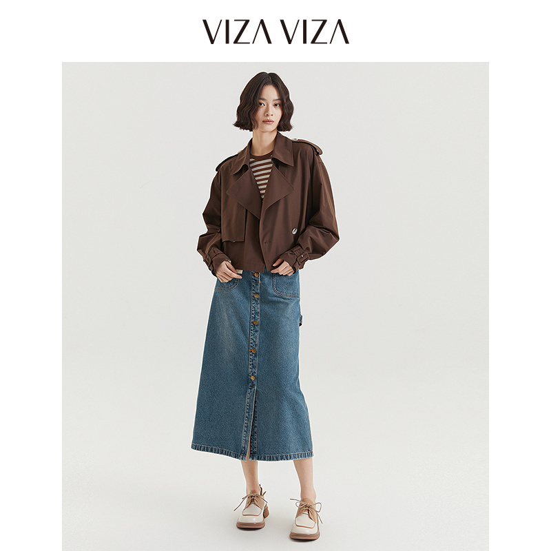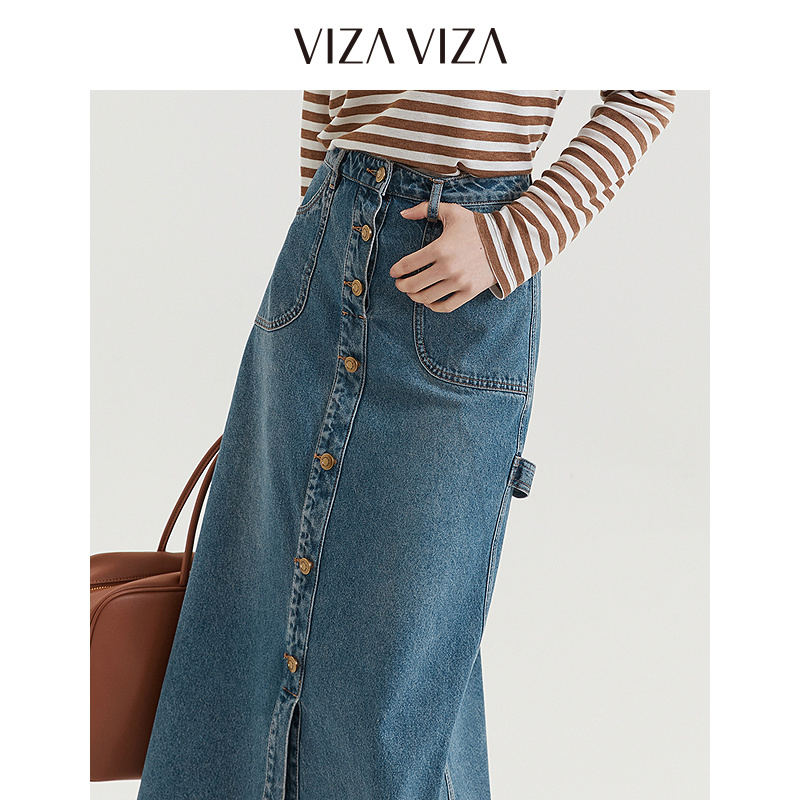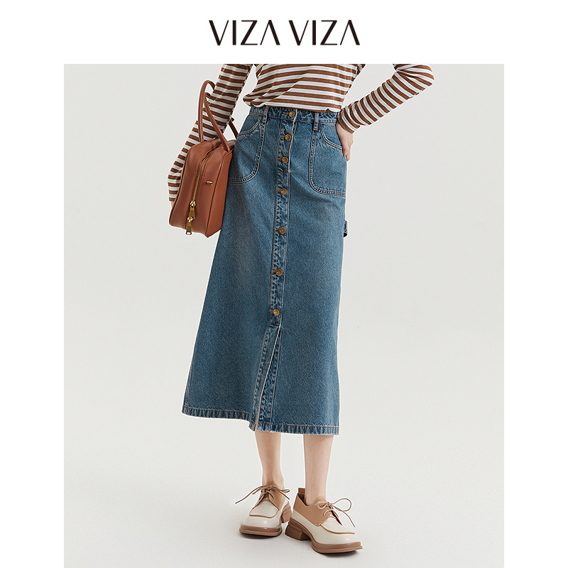 VIZA VIZA 2025秋季新款通勤气质百搭纯棉水洗牛仔高腰直筒半身裙