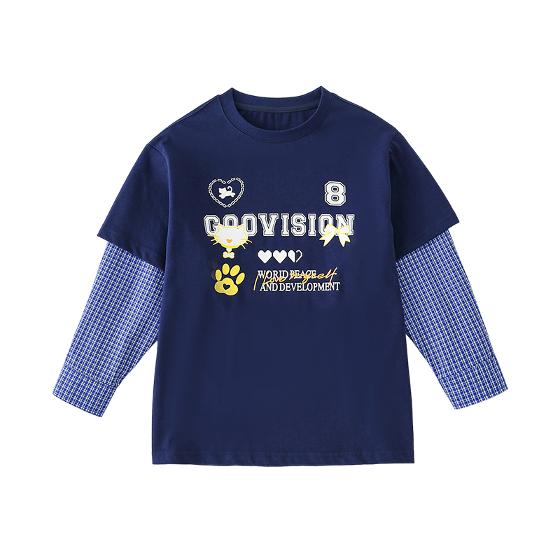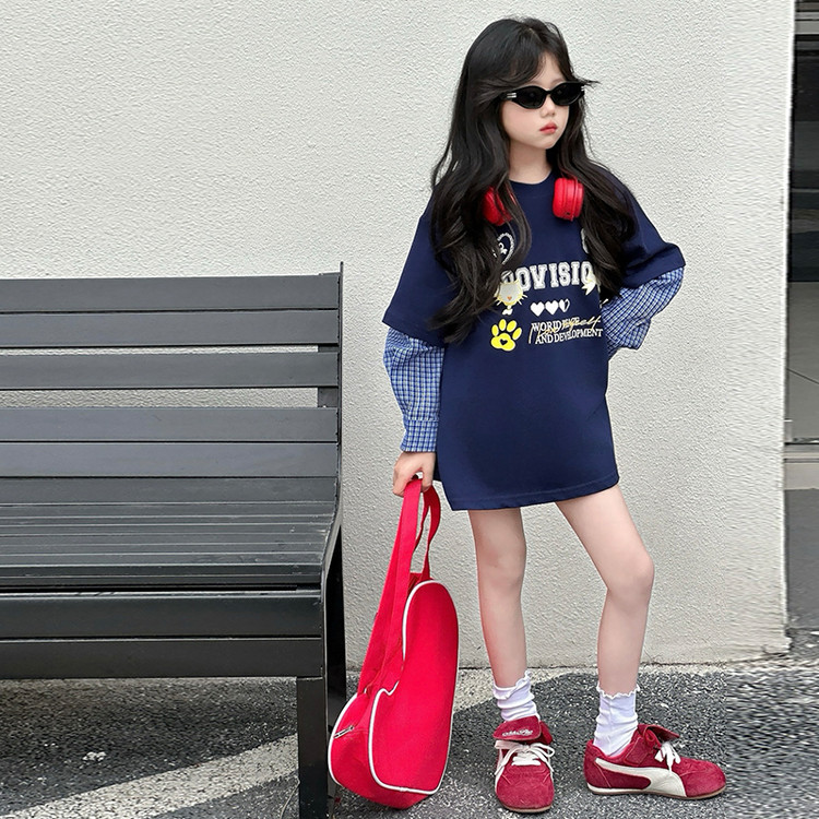 女童假两件长袖T恤春季2025新款大儿童圆领印花t中长款上衣打底衫