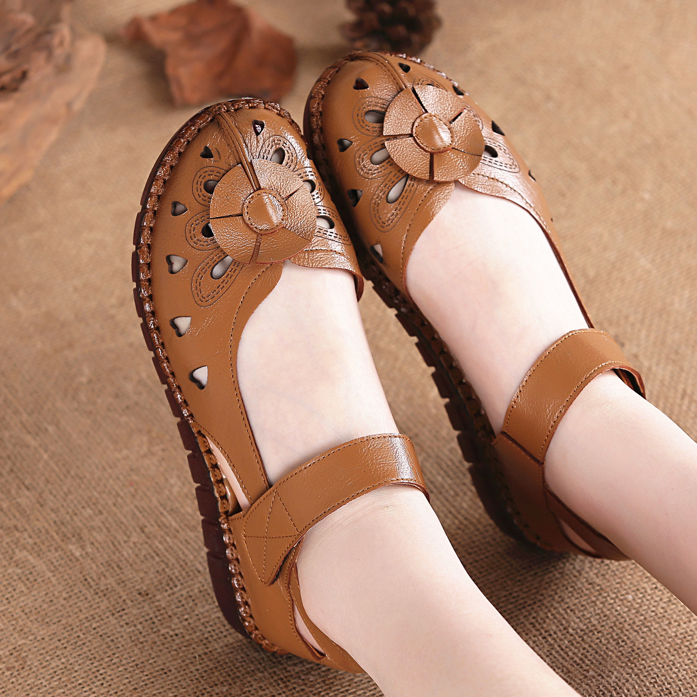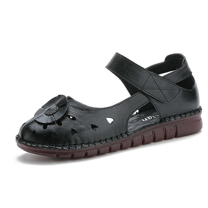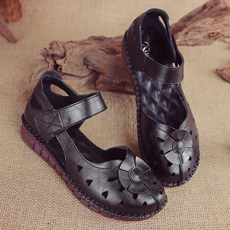 妈妈凉鞋真皮镂空包头中老年凉鞋老人软底平底舒适防滑民族风女鞋