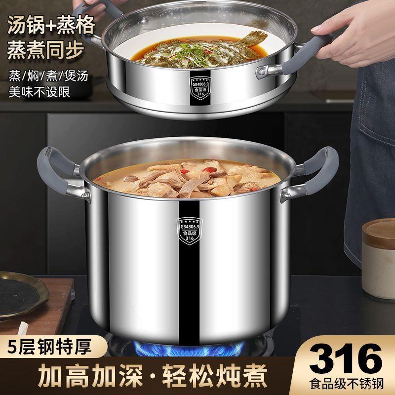 巨厚316不锈钢加深无铆钉防烫商用家用汤锅大容量圆桶蒸煮一体锅