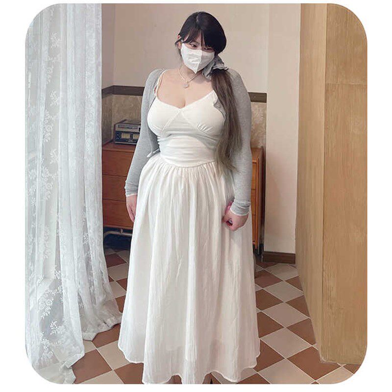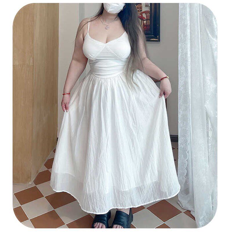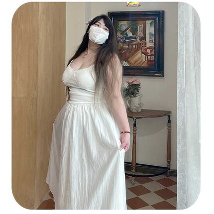气质白莲花大码女装吊带蕾丝V领连衣裙胖MM温柔风浪漫白色仙女裙
