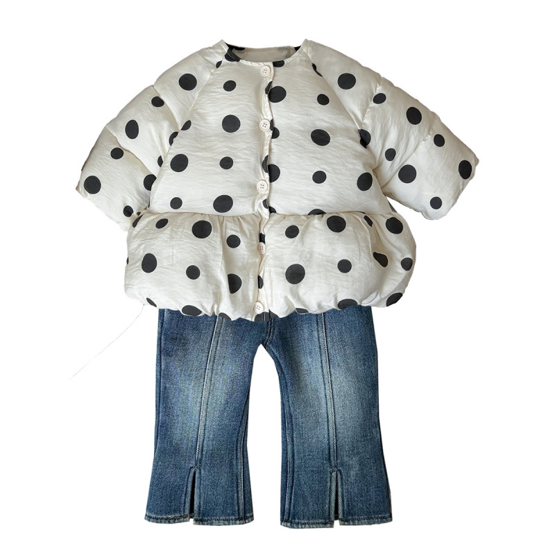 幼禾韩国儿童洋气波点棉服冬款女童打底衫保暖外套棉衣牛仔裤套装