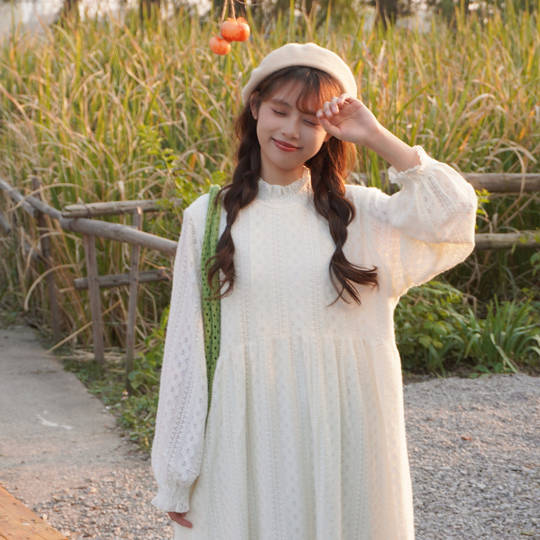 温柔少女奶油蕾丝花边领连衣裙