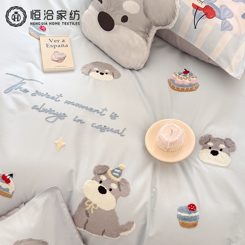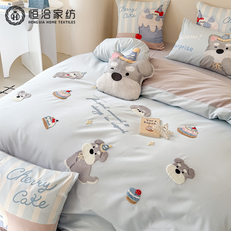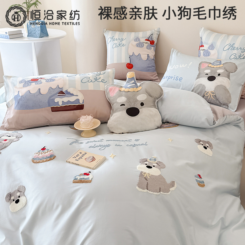 卡通风可爱全棉长绒棉四件套儿童小狗毛巾刺绣被套床品1.2蓝色