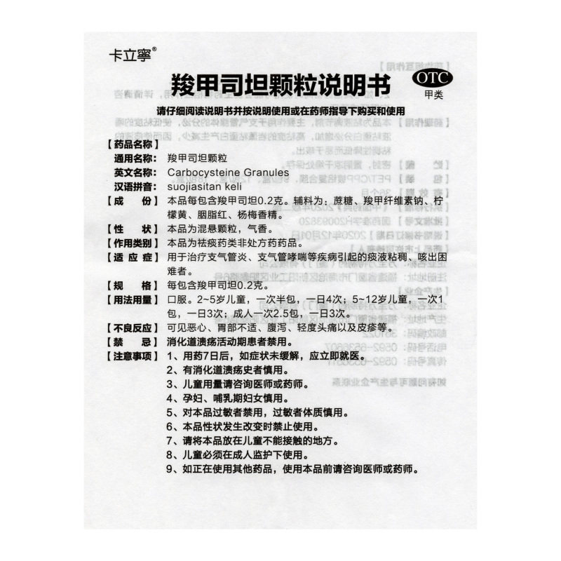 【卡立宁】羧甲司坦颗粒0.2g*12袋/盒支气管炎支气管哮喘痰液粘稠止咳哮喘