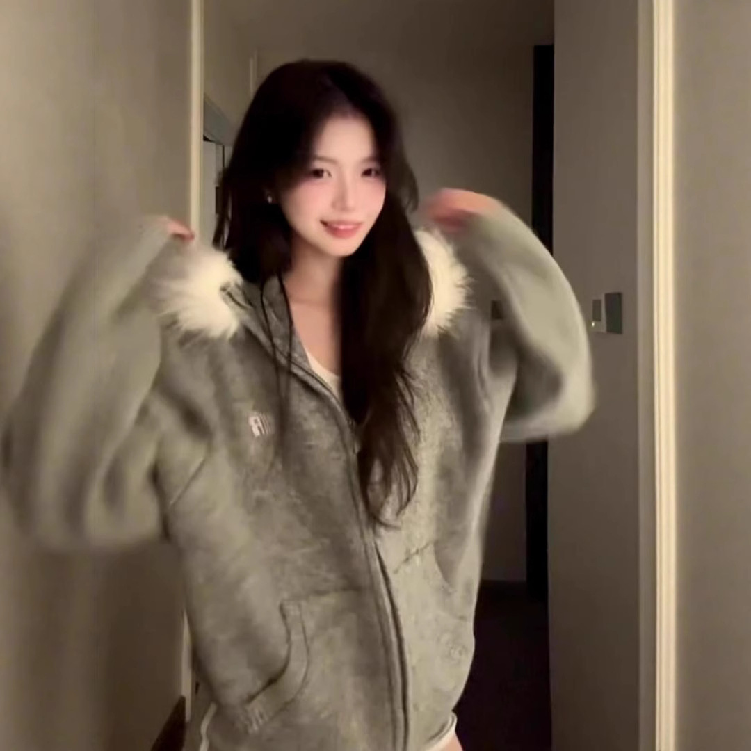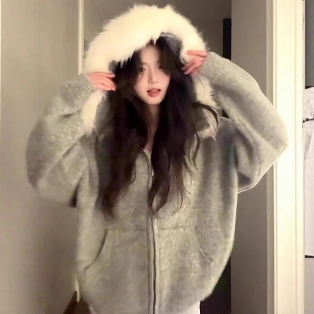 灰色毛领连帽毛衣外套女秋冬慵懒宽松显瘦休闲设计感百搭针织开衫