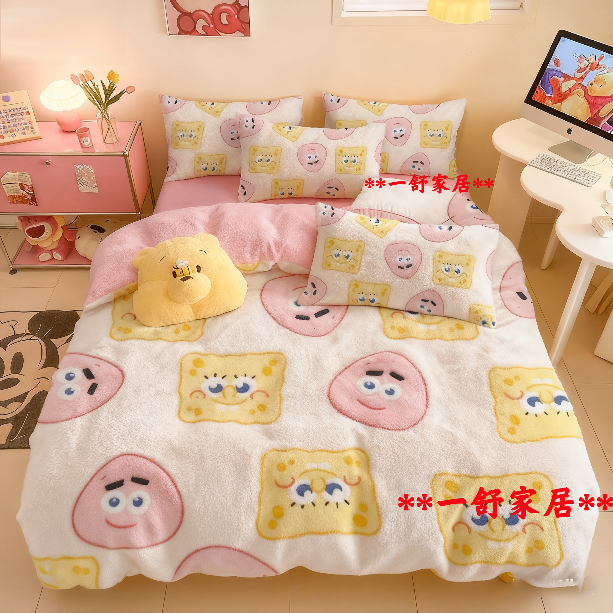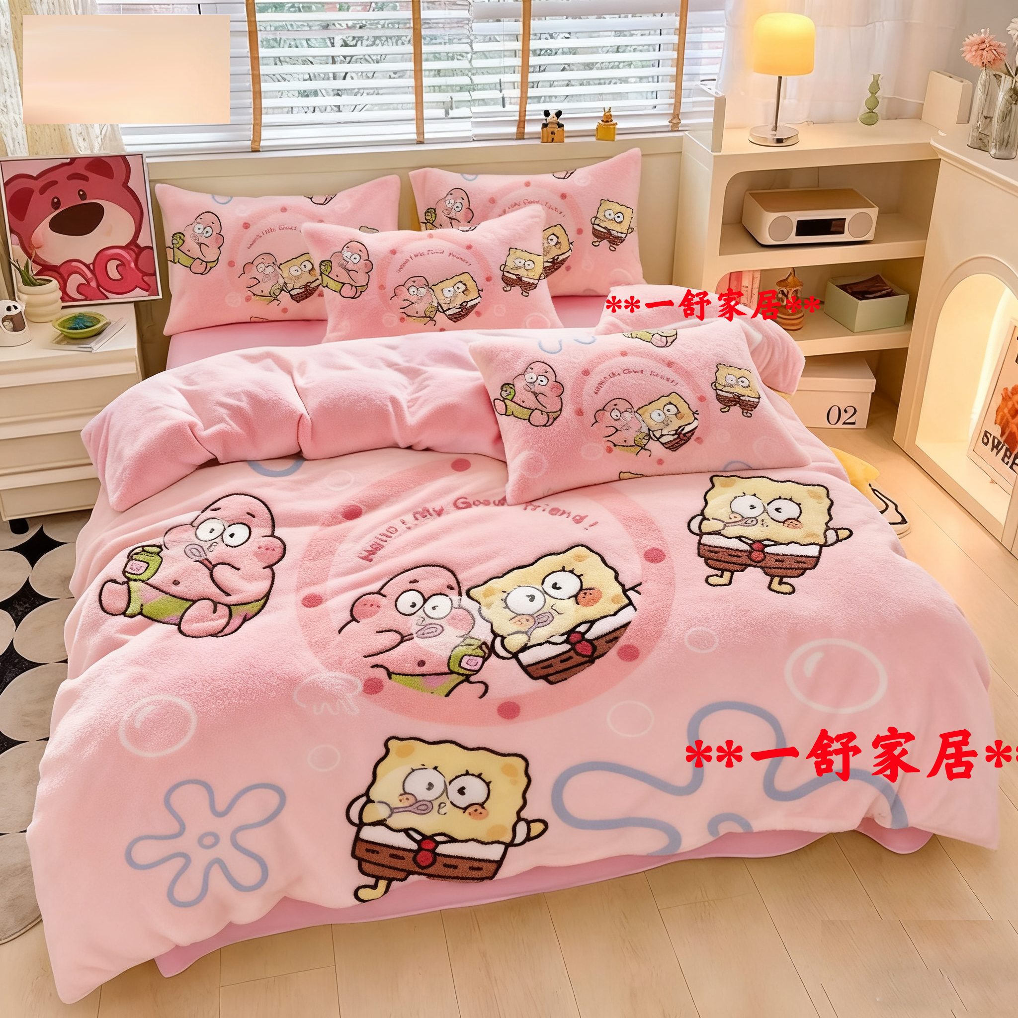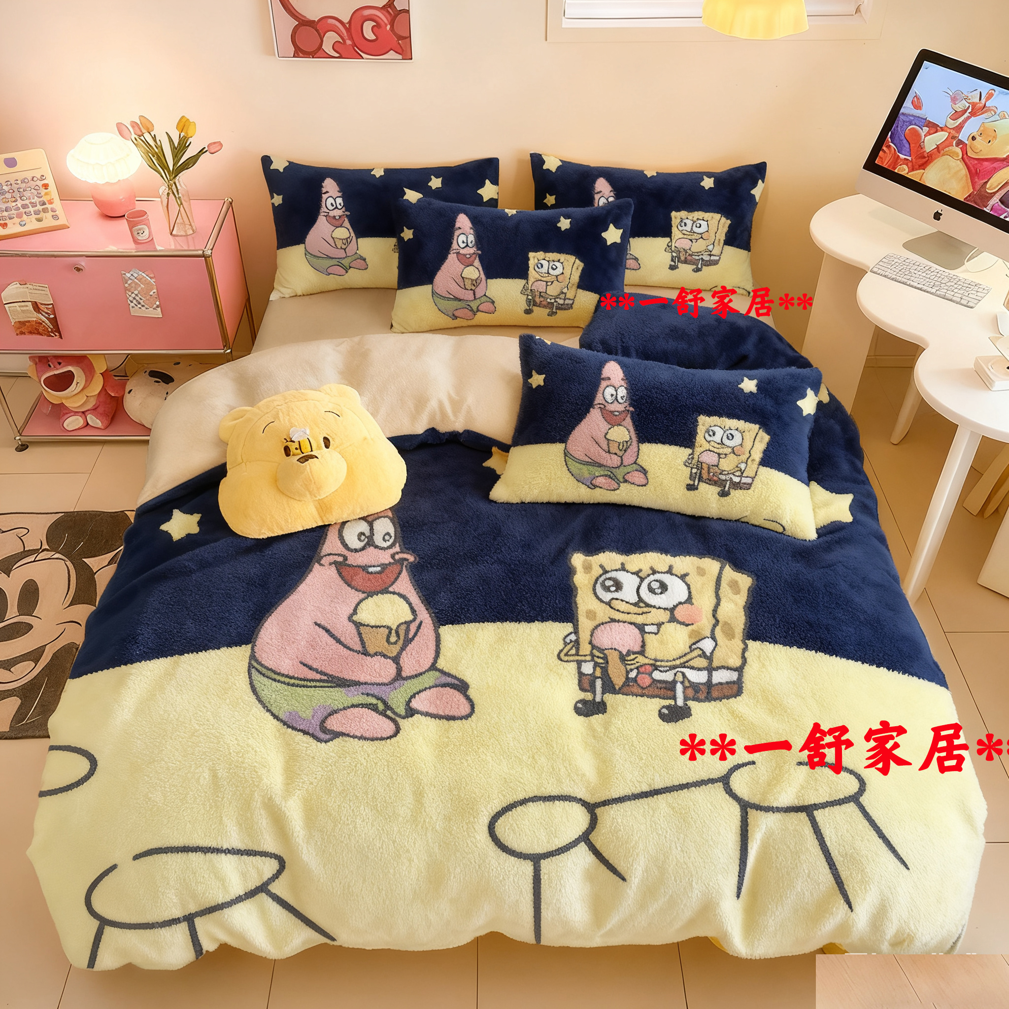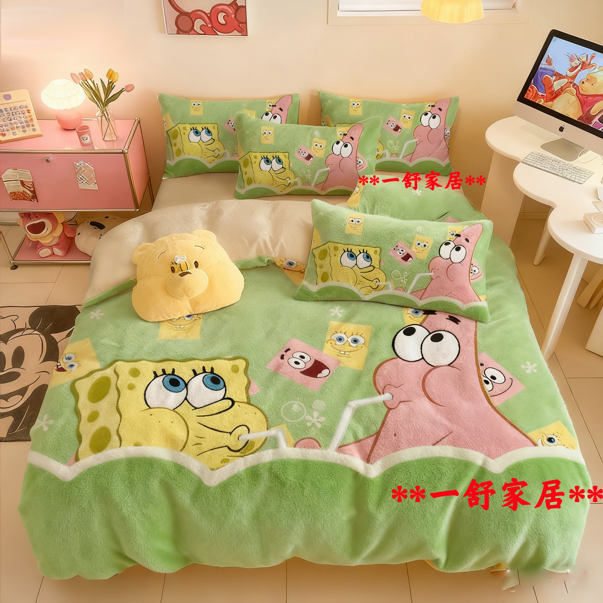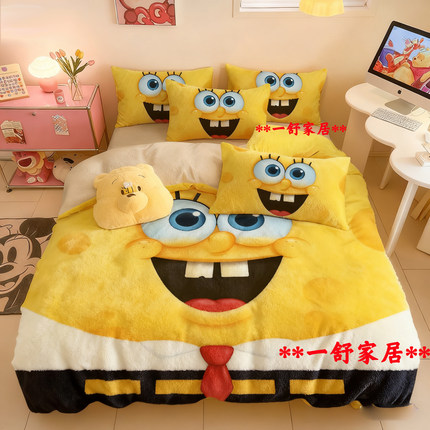 海绵宝宝卡通床上四件套牛奶绒全棉男孩床单被套儿童床品三件套男