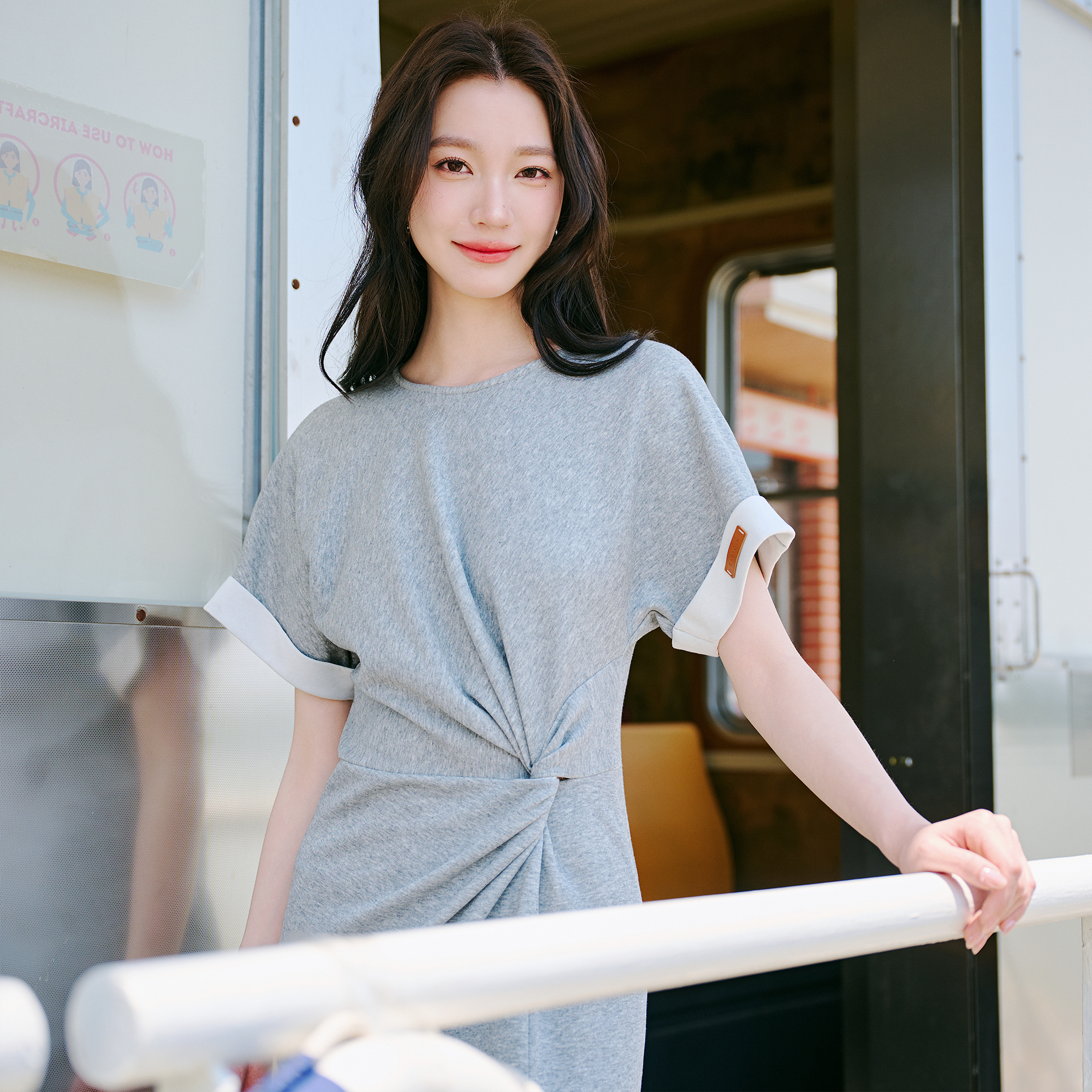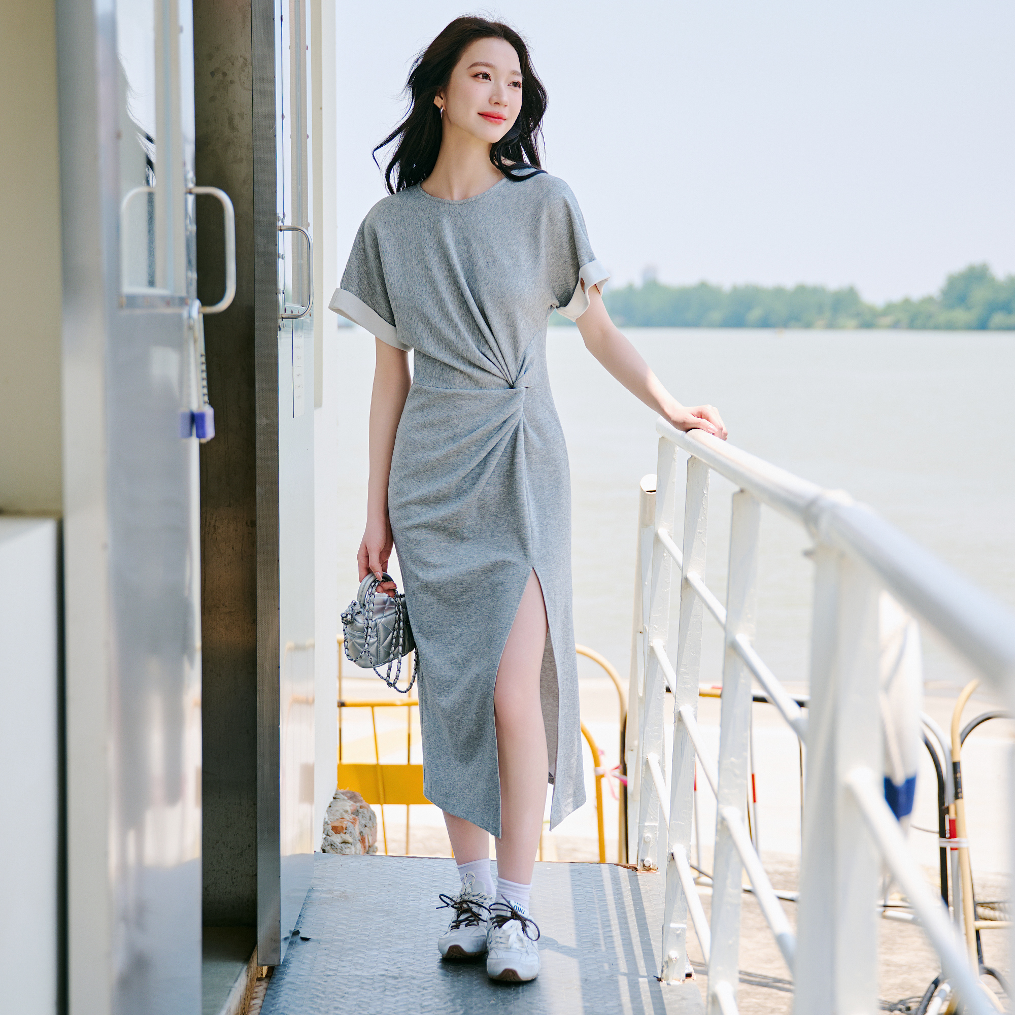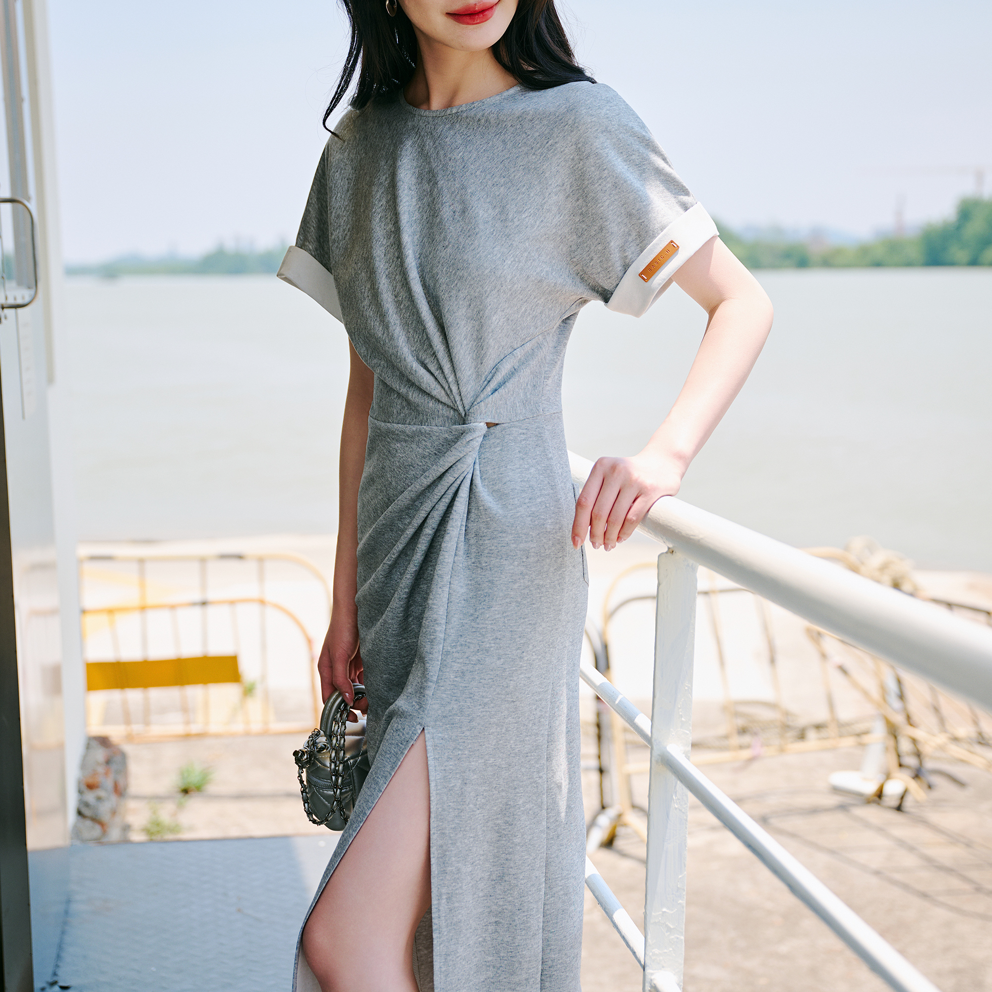 Basic House/百家好简约通勤扭结连衣裙女2025夏季显瘦开叉T恤裙