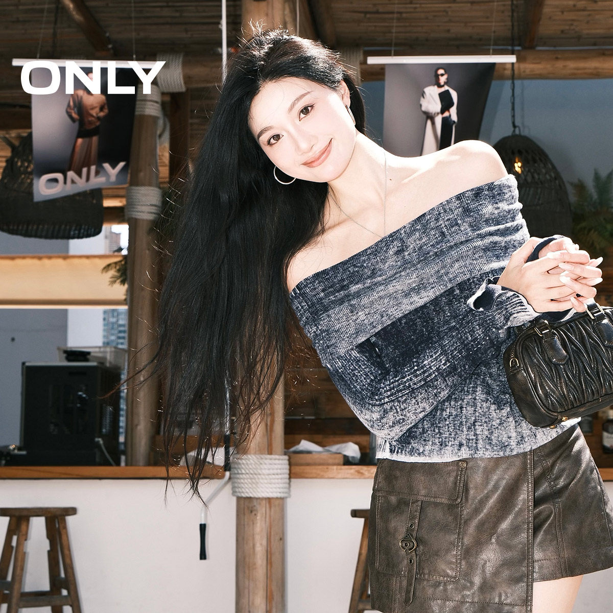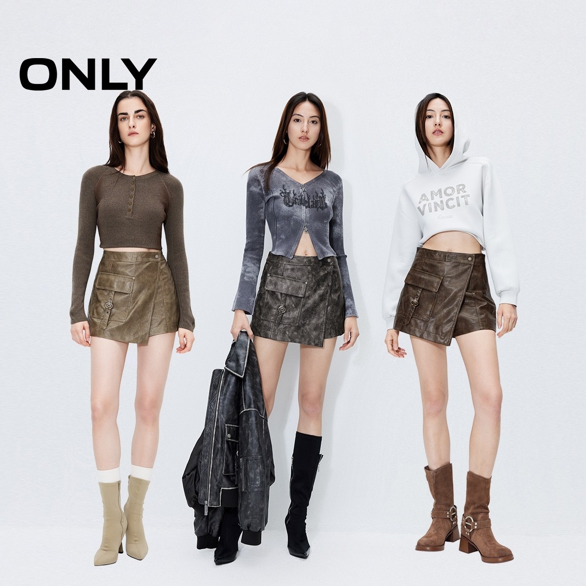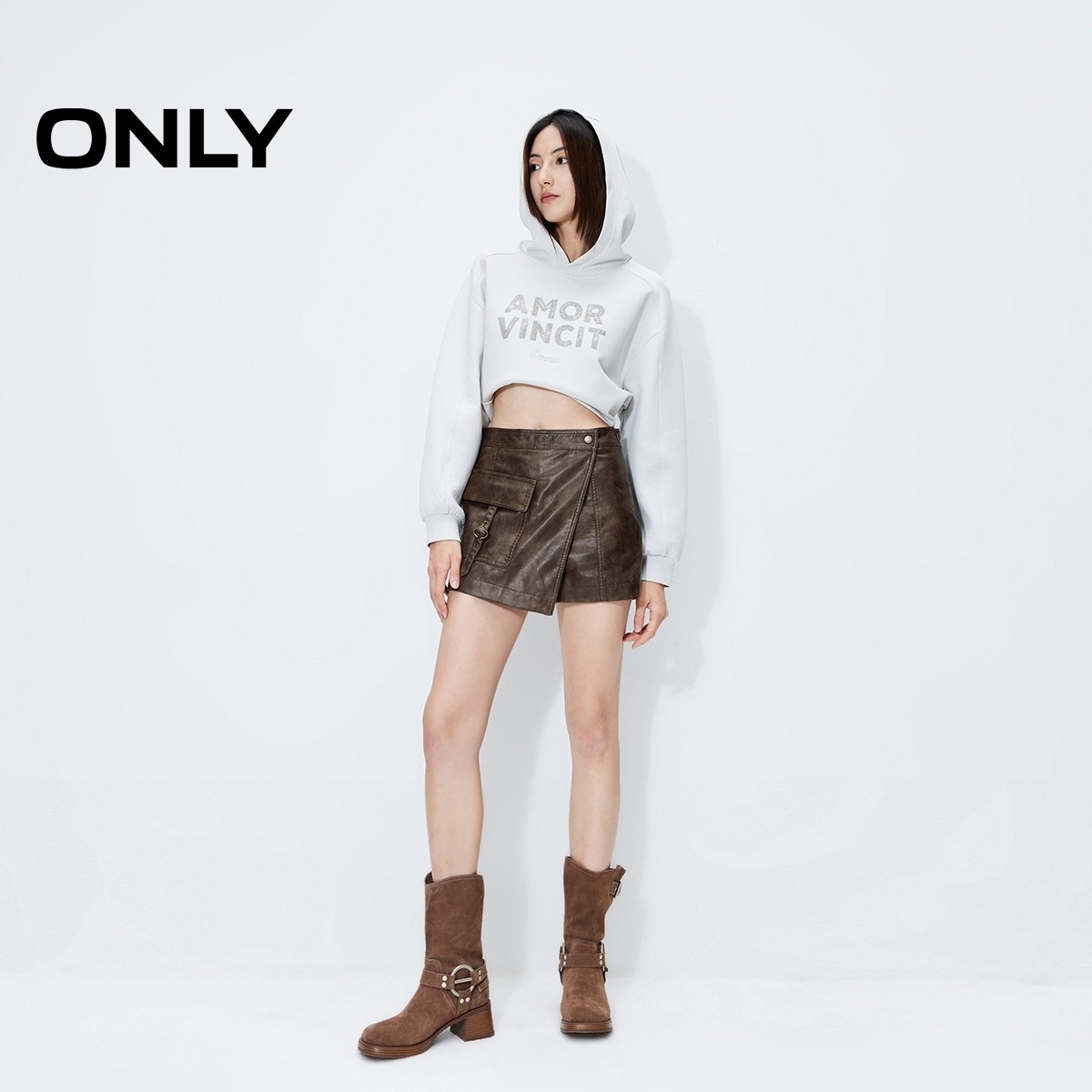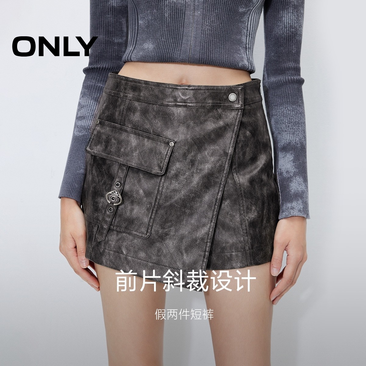 ONLY高腰口袋PU假两件短裤休闲裤