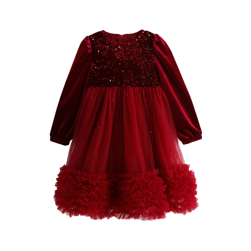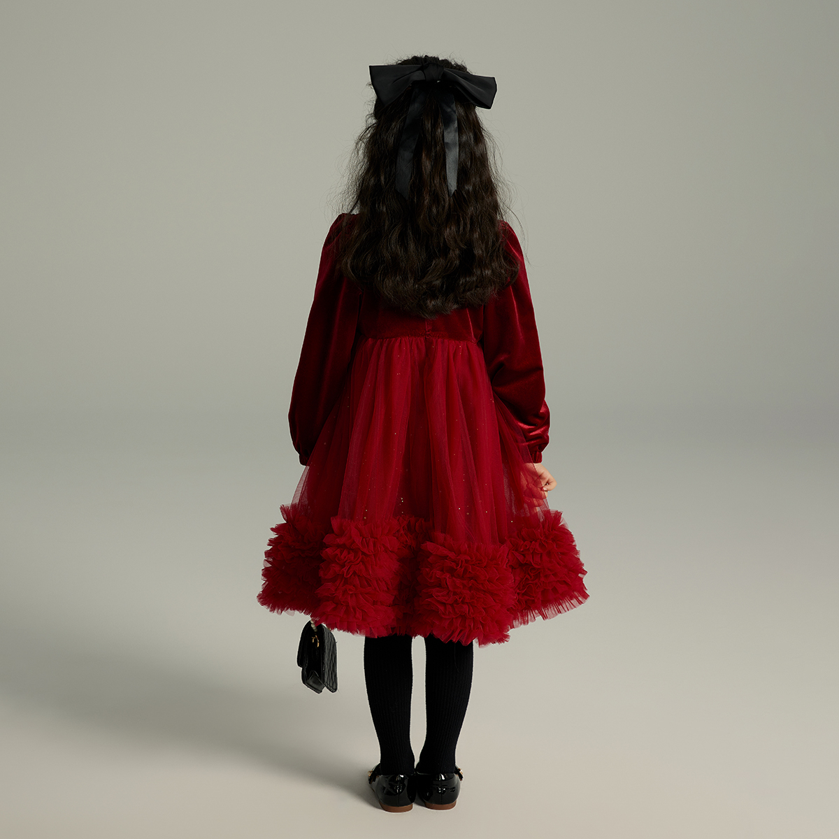 沫沫冬装童装女童裙子2025秋冬季新款休闲洋气宝宝红色网纱连衣裙