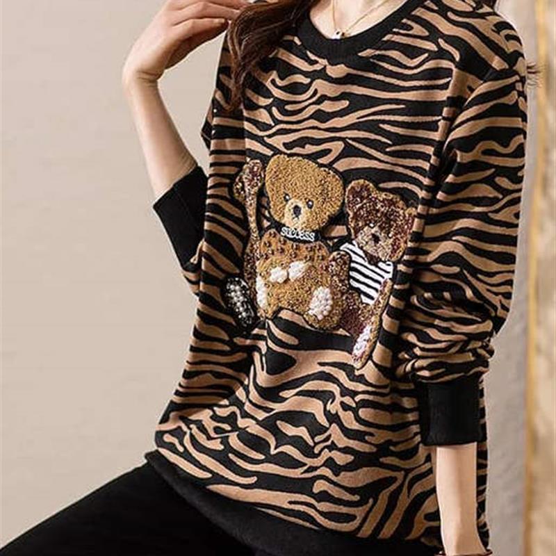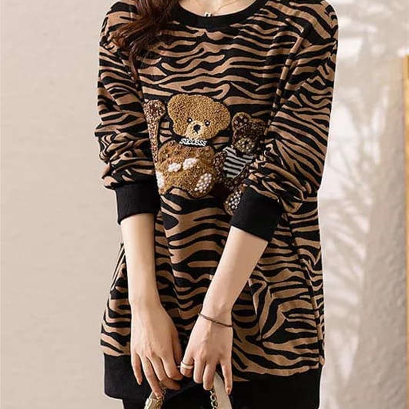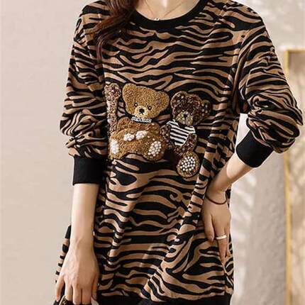 时髦豹纹印花卫衣t恤女秋季2025新款时尚宽松休闲百搭中长款上衣