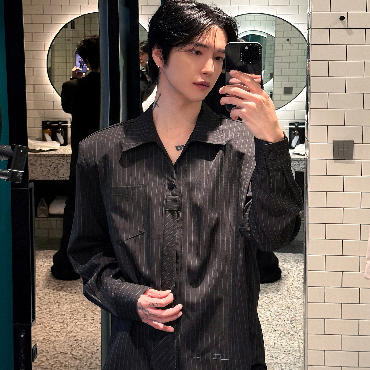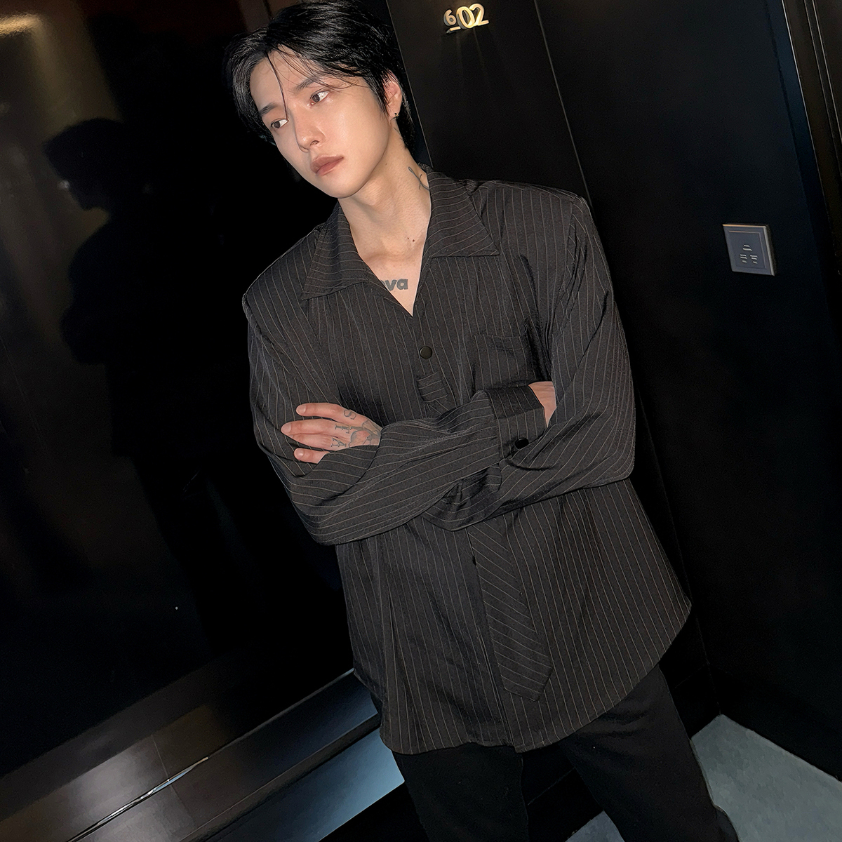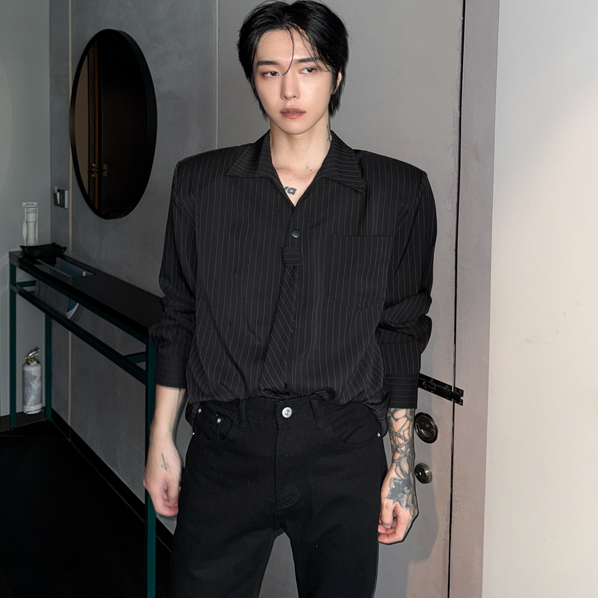 子上男装 拼接竖条纹领带衬衫男宽松垫肩韩版高级感痞帅复古长袖