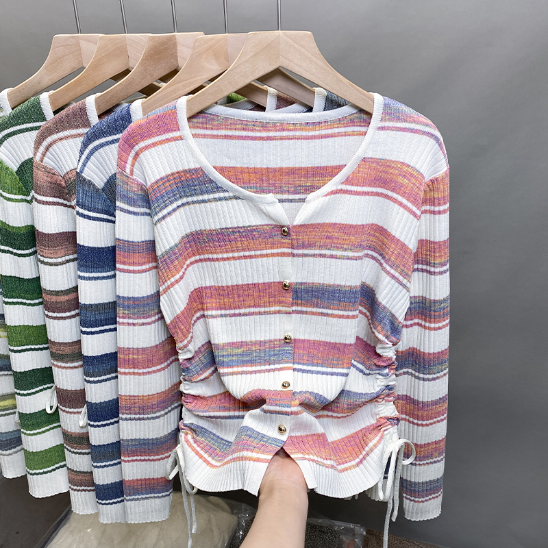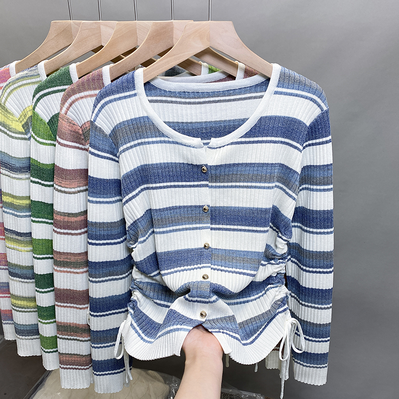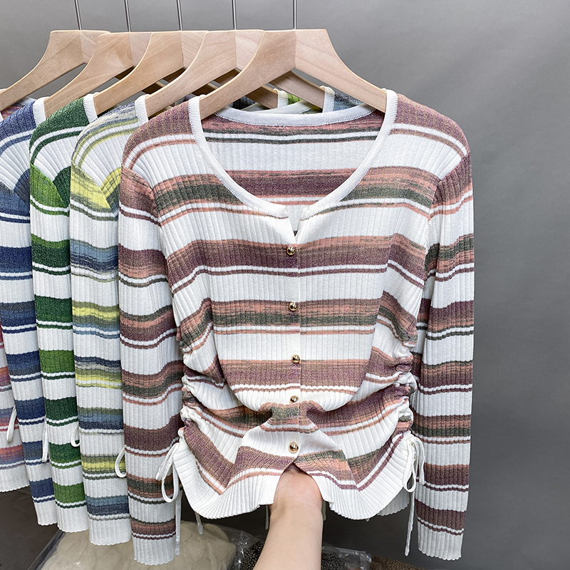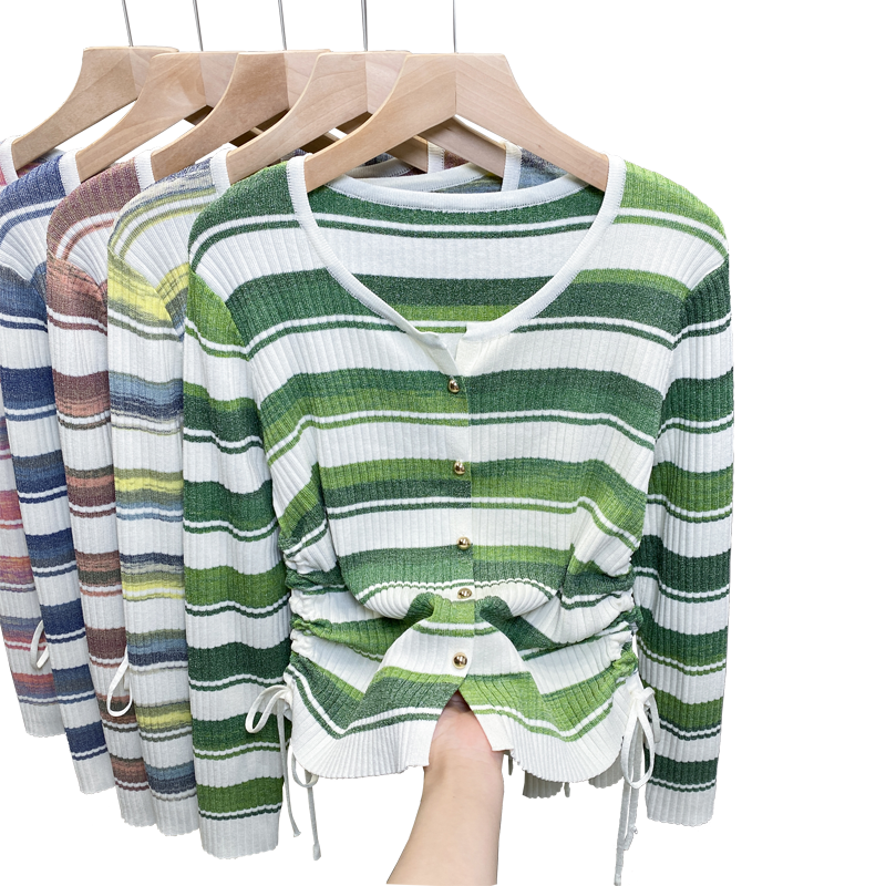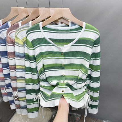 圆领冰丝针织开衫女2025春夏秋新款条纹空调衫外穿上衣抽绳防晒衣