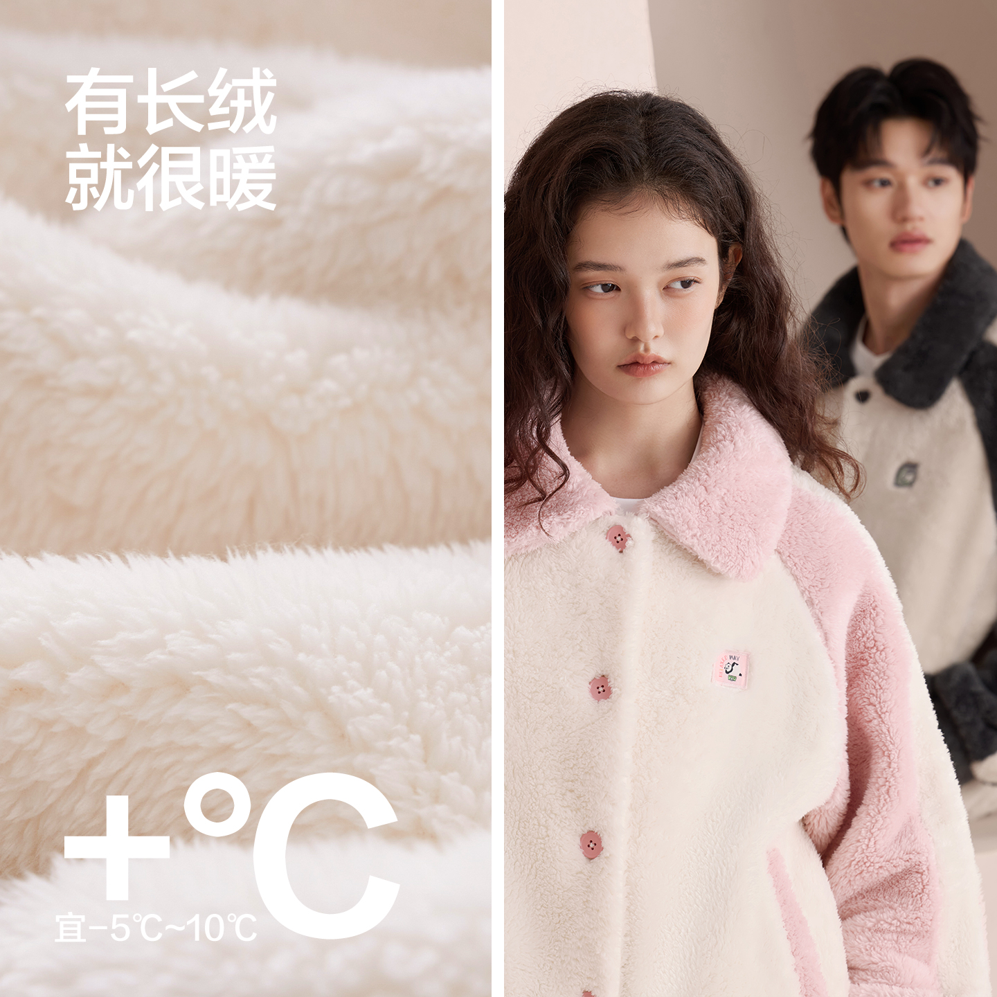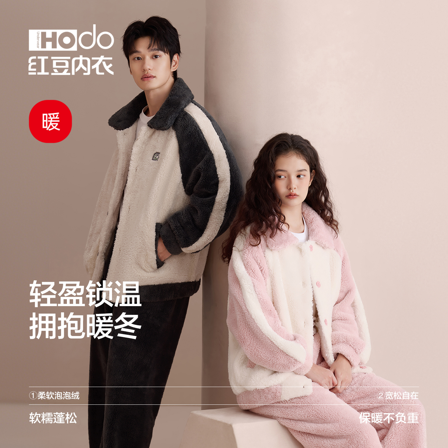 红豆情侣泡泡绒睡衣加厚珊瑚绒防静电男女士外穿棒球服家居服套装