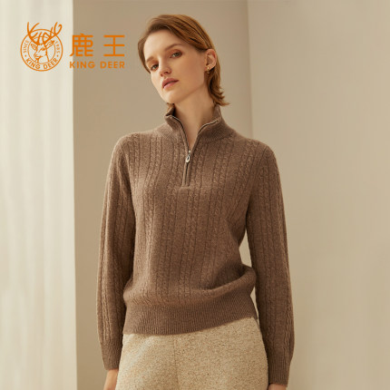 鹿王100%羊绒衫女士半高领拉链针织保暖简约高级毛衣套衫秋冬新款