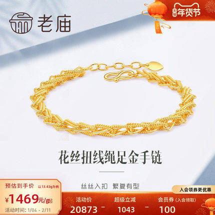 老庙黄金花丝不规则扭线绳足金手链手饰送礼计价旗舰店送礼物官方