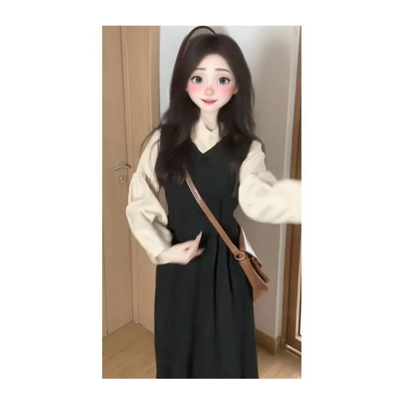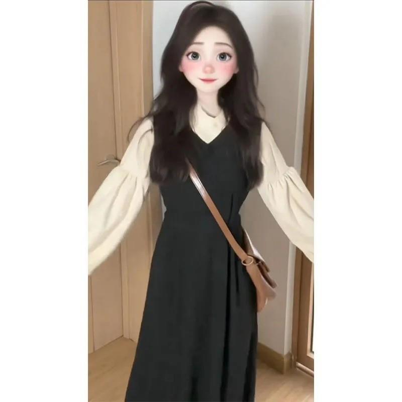 长袖衬衫套装背带长裙两件套女装春秋季2025新款小个子减龄连衣裙