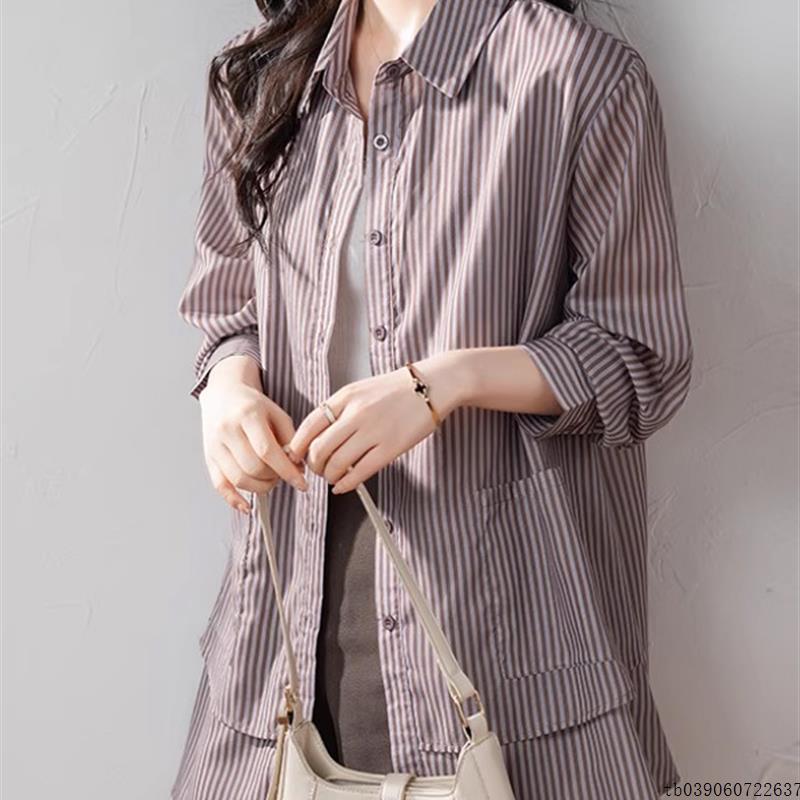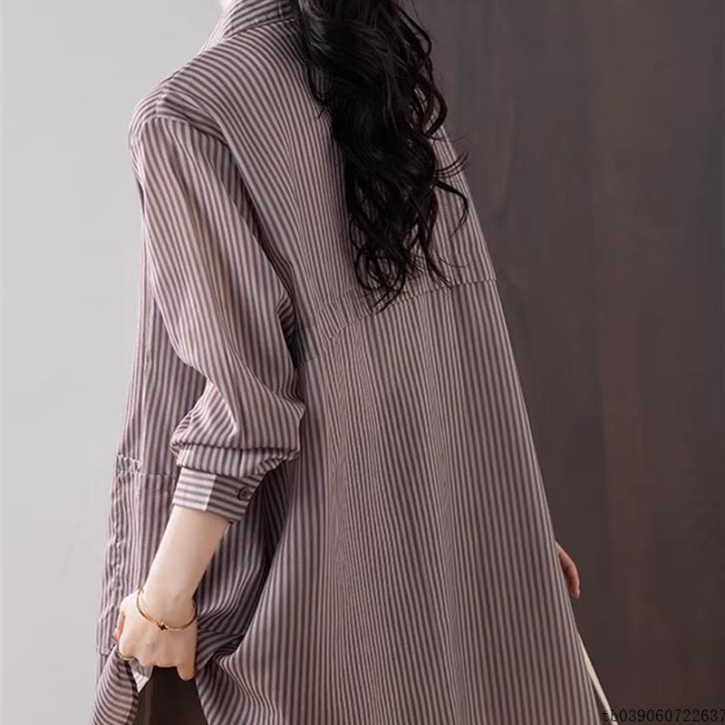大码翻领条纹长袖衬衫外套女早秋新款中长款宽松休闲百搭开衫上衣
