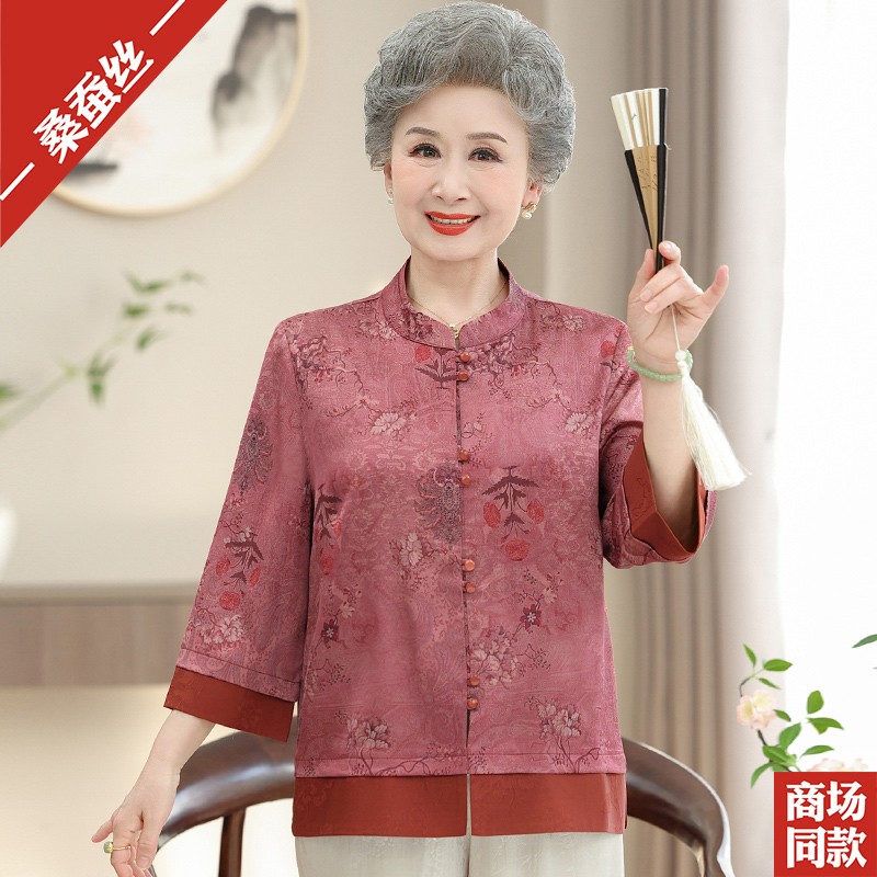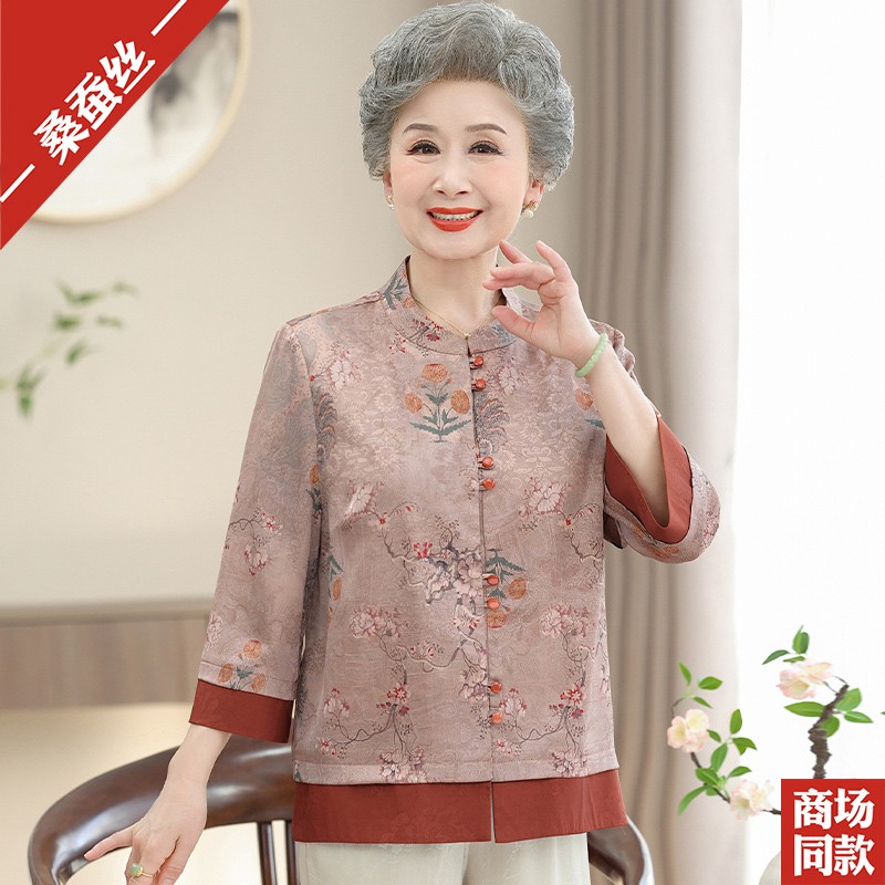 中老年人女装香云纱上衣服新中式印花唐装妈妈装高档真丝衬衫夏装