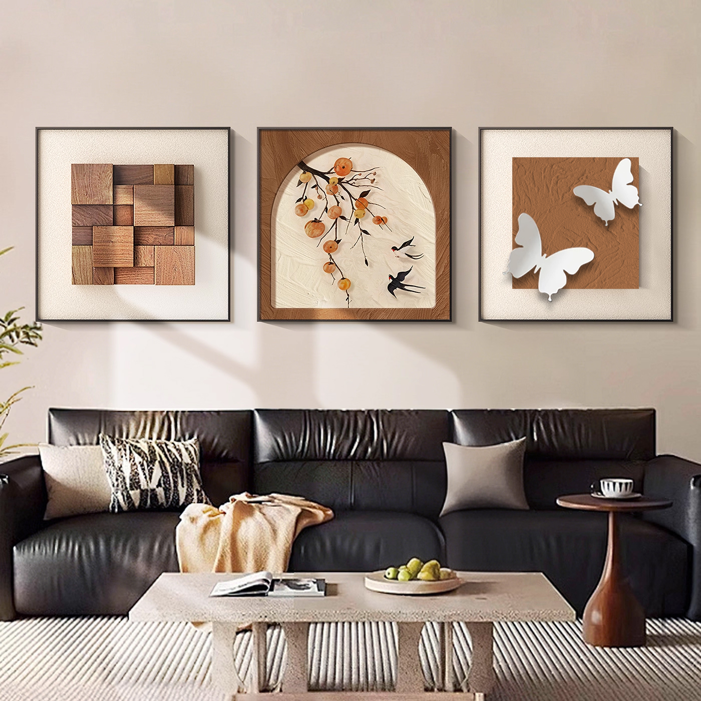 立体胡桃木实木客厅挂画柿如意寓意中古沙发背景墙餐厅装饰画壁画