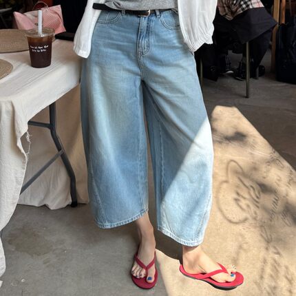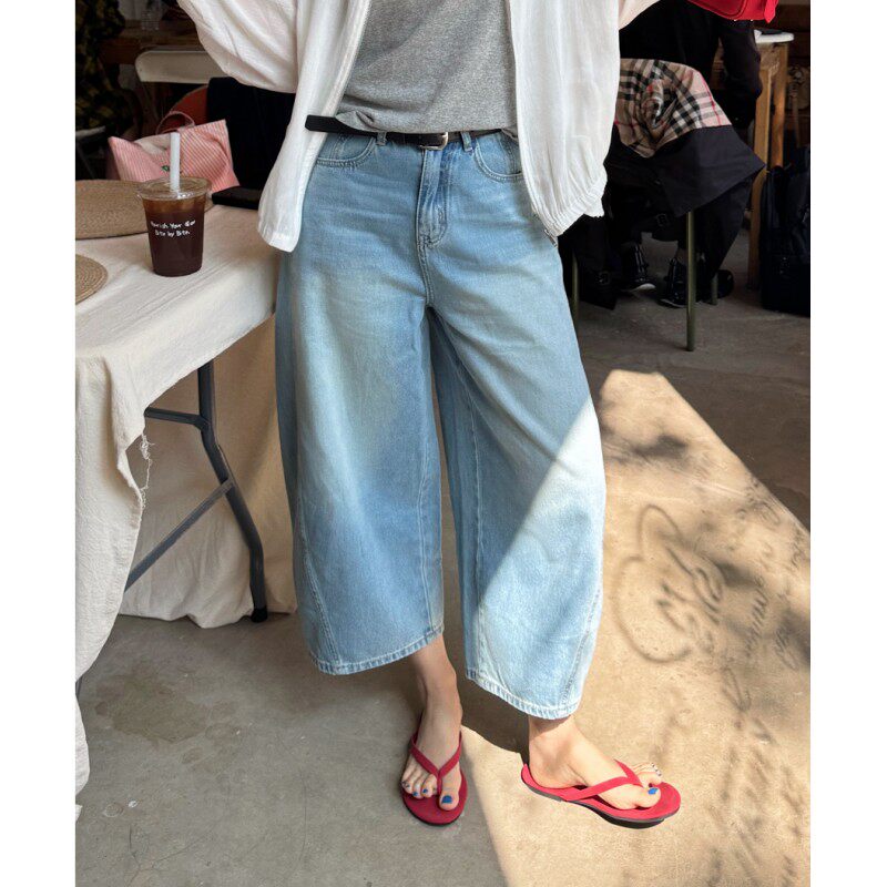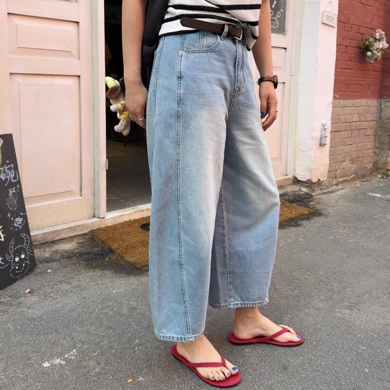 ACRAB 很好穿的浅蓝色复古水洗9分弯刀牛仔裤长裤阔腿夏季休闲裤