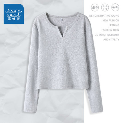 JR真维斯灰色T恤女2025新款秋季紧身长袖上衣V领设计感内搭打底衫