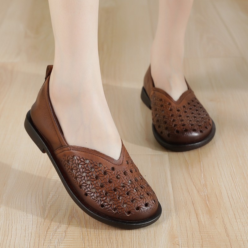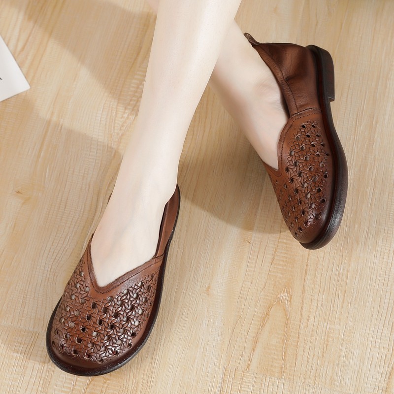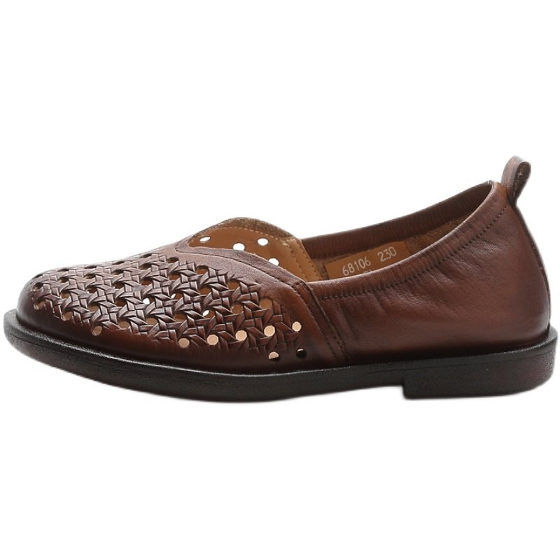 女鞋真皮软底妈妈鞋2021春夏新款复古洞洞鞋平底中老年人镂空凉鞋