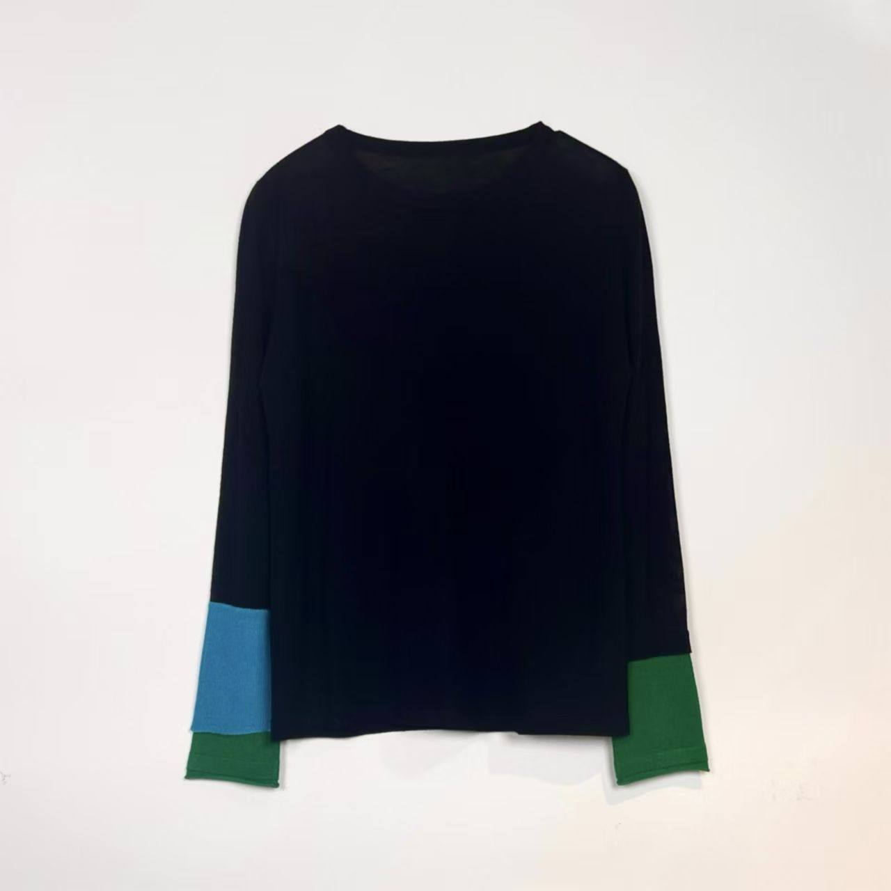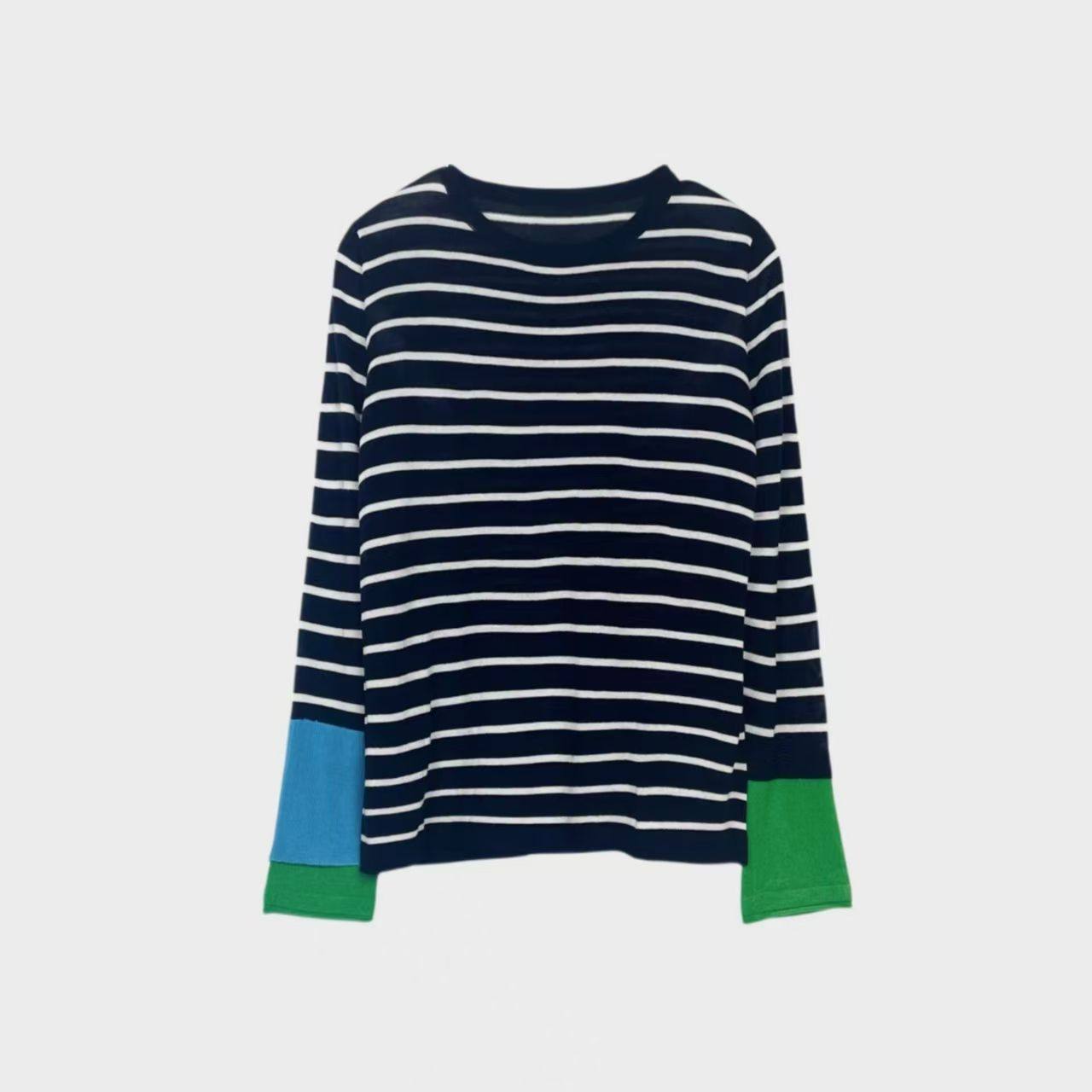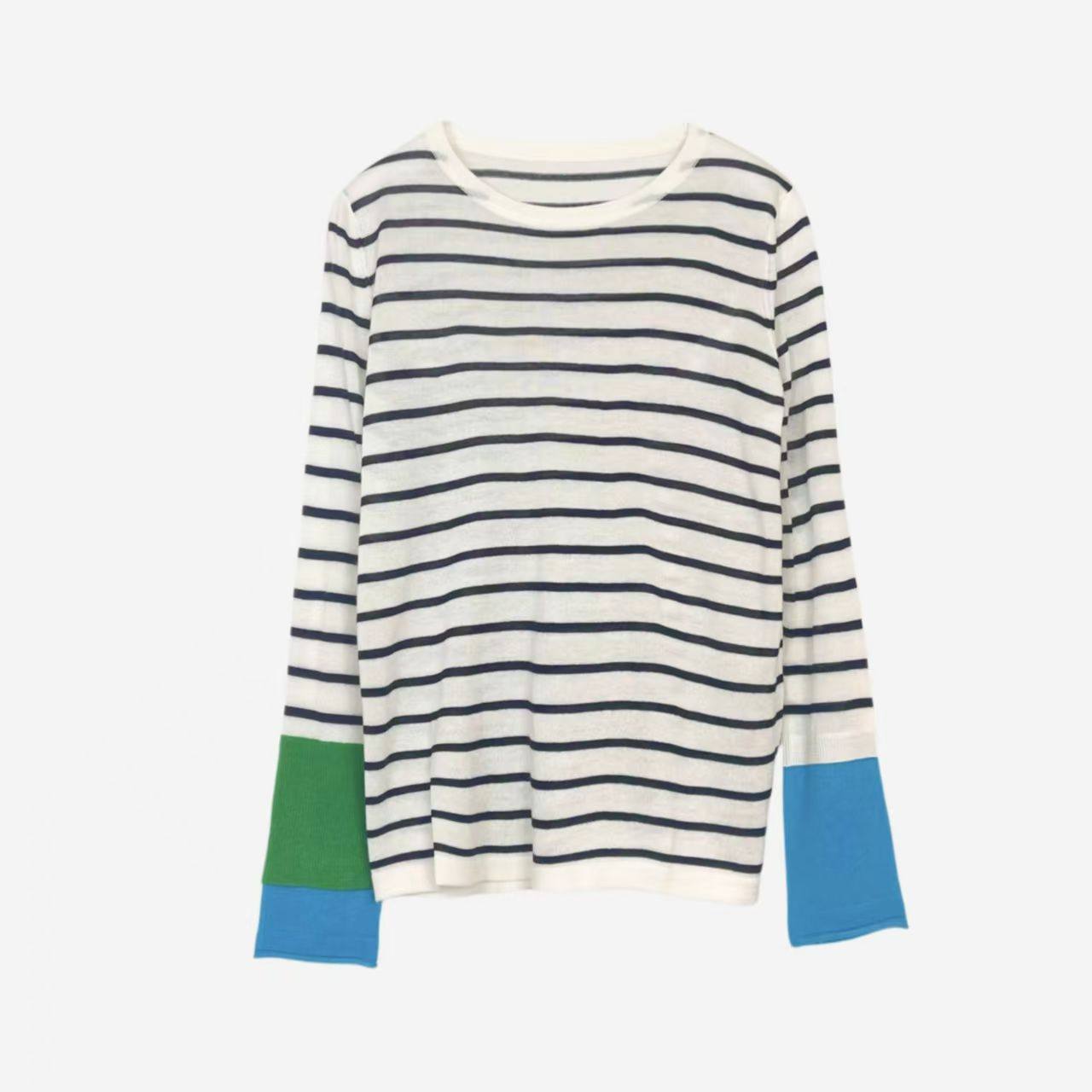 可机洗丝光羊毛 设计感双层袖撞色条纹针织衫圆领长袖T恤女早秋新