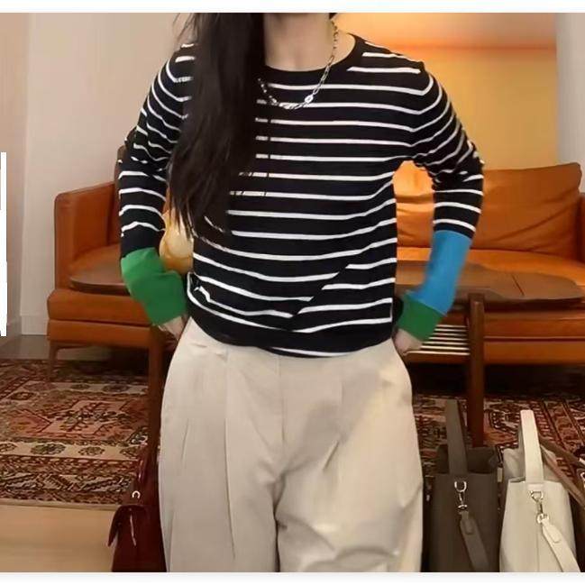 撞色条纹针织衫圆领长袖T恤女早