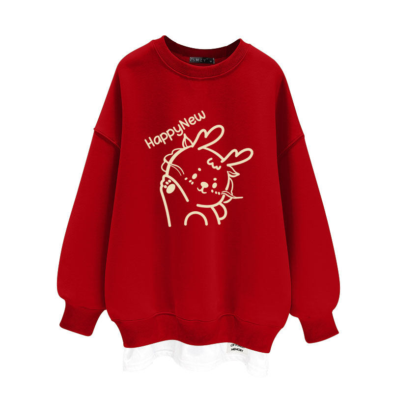 2025春秋冬季萌趣卡通红色中长款加绒加厚宽松套头圆领卫衣女潮