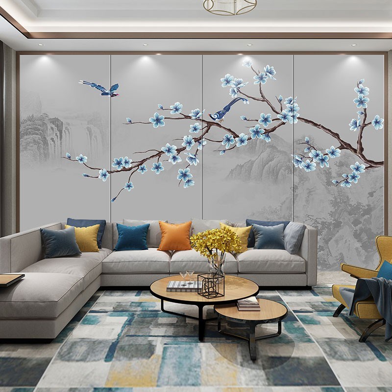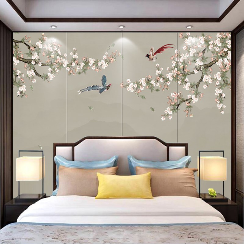 新中式刺绣硬包背景墙客厅沙发电视背景软包卧室床头花鸟独绣墙布